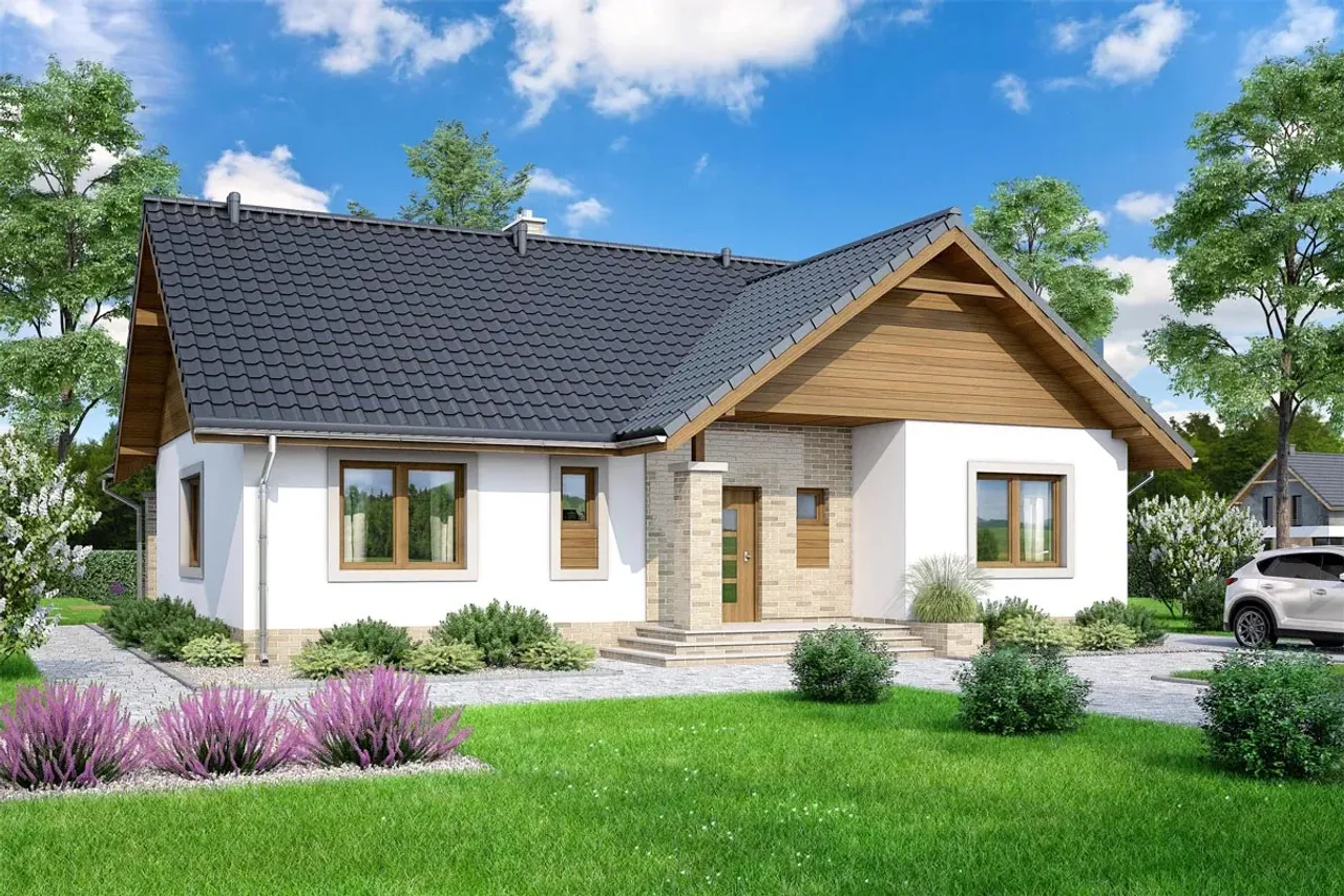 Drewniana konstrukcja dachu pokryta dachówką ceramiczną lub betonową chroni wnętrze przed zmienną pogodą i podkreśla tradycyjny styl architektury. Brak piwnicy sprawia, że dom dobrze wpisuje się w potrzeby dynamicznej rodziny, która ceni prostotę, a zarazem funkcjonalność własnych czterech kątów.