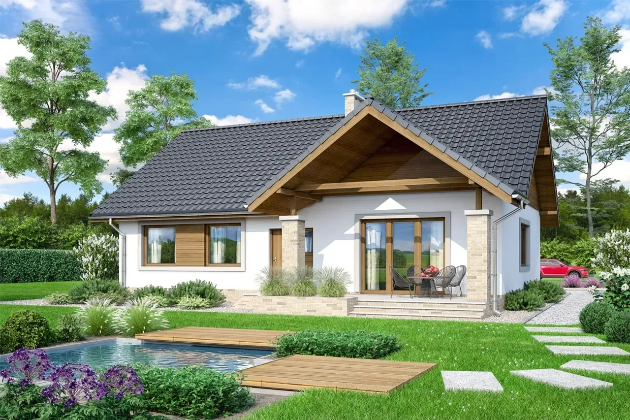 Projekt domu jednorodzinnego Mokka 4 to idealny wybór dla rodziny, która szuka wygodnych i praktycznych rozwiązań na nowoczesnej, parterowej przestrzeni. Ten tradycyjny dom o dwuspadowym dachu doskonale sprawdzi się na działce z kalenicą równoległą do drogi. Przemyślany układ czterech pokoi pozwala cieszyć się komfortem codziennego życia blisko natury.