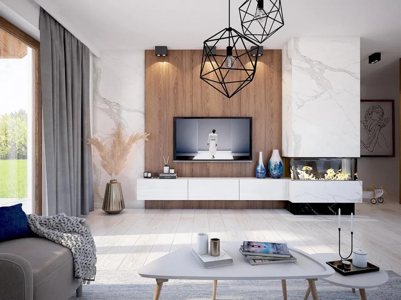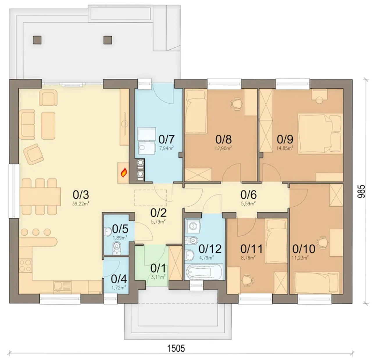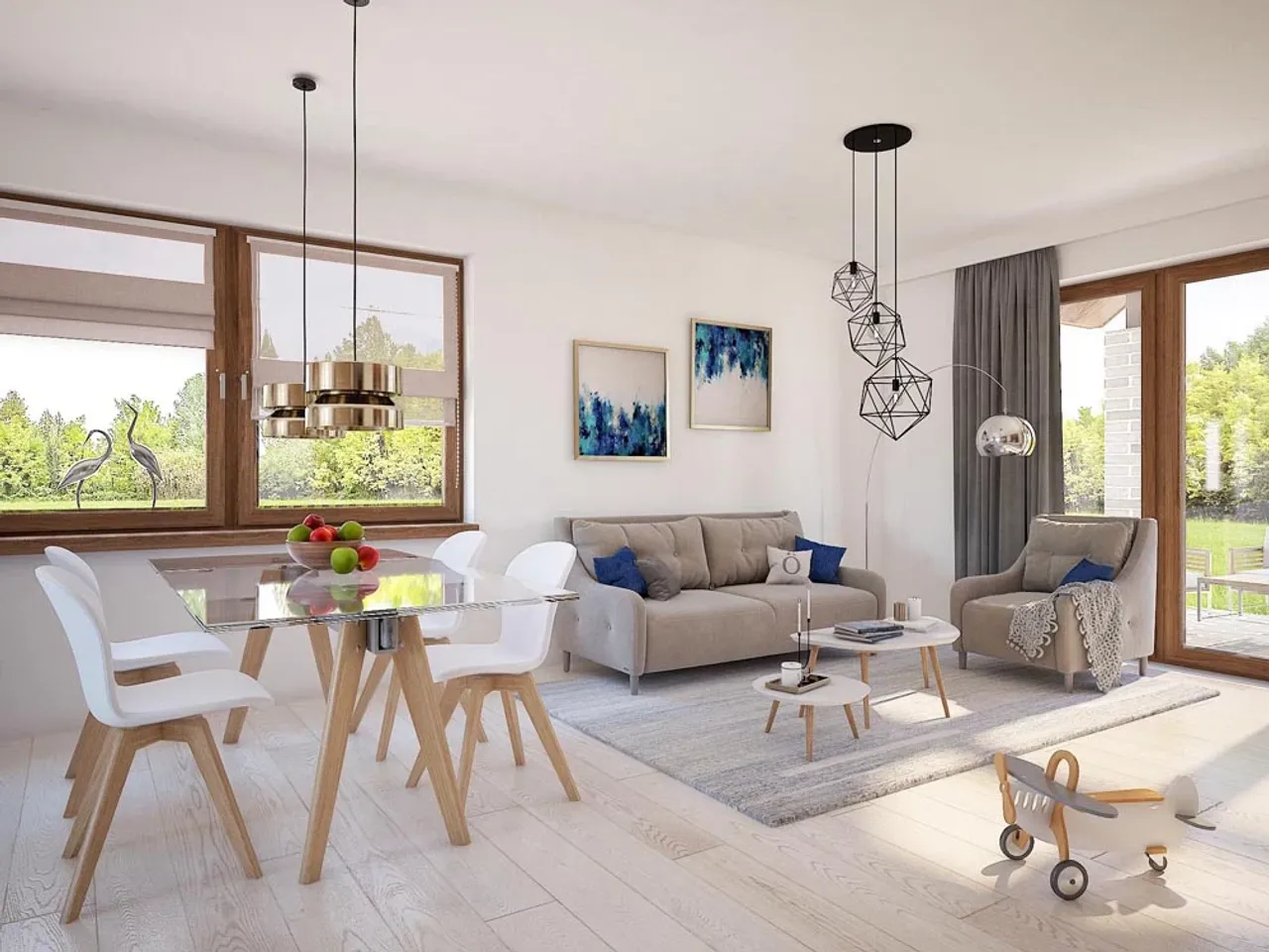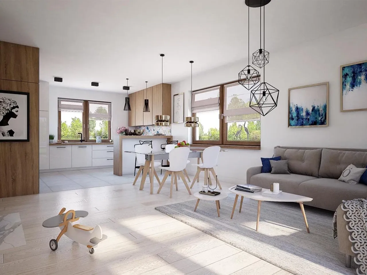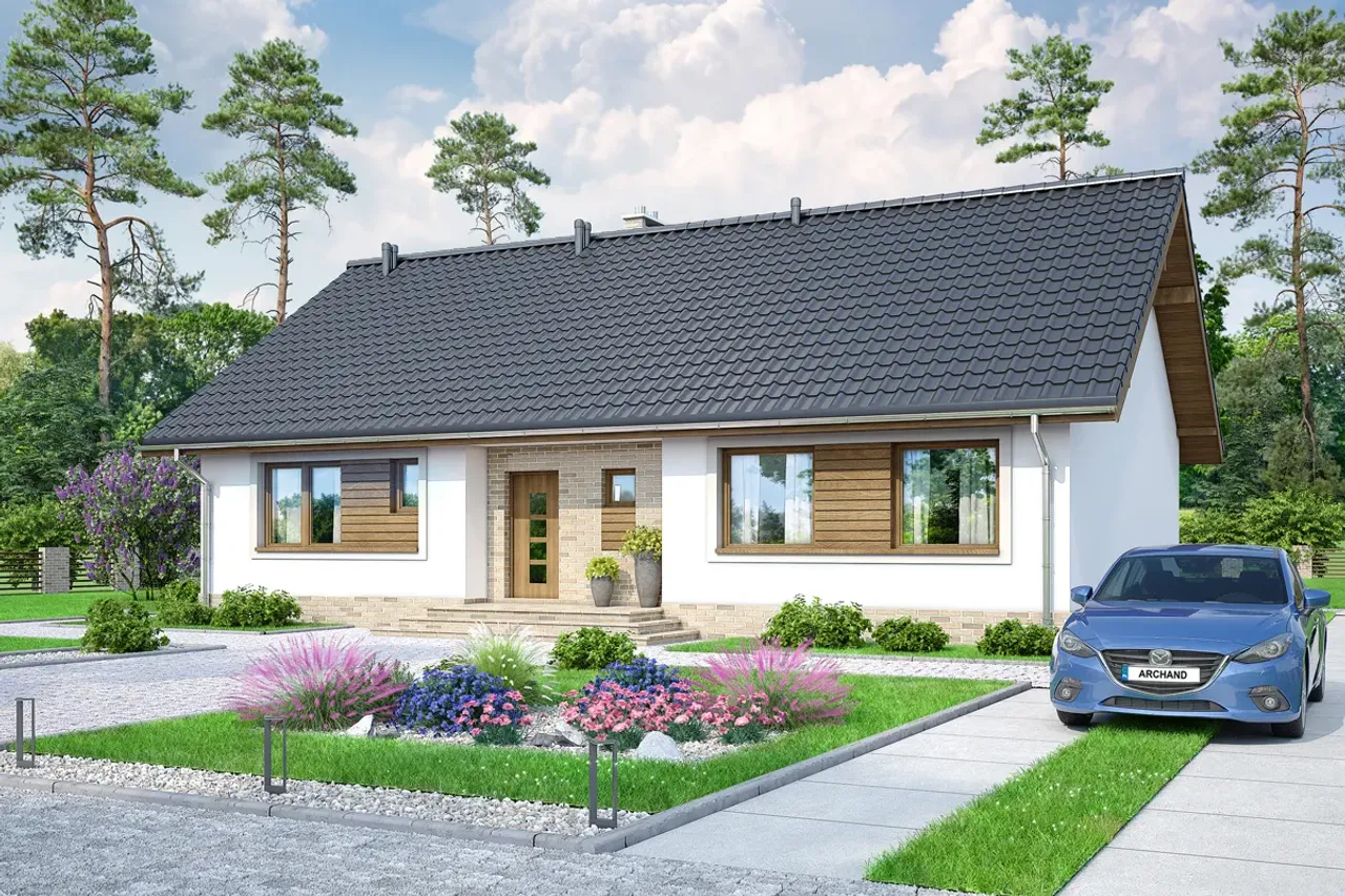 Projekt domu Mokka 6 został zaprojektowany z myślą o rodzinach ceniących przytulność oraz praktyczność rozwiązań. Brak garażu oznacza więcej miejsca na część mieszkalną, a podział na pięć pokoi umożliwia komfortowe funkcjonowanie nawet licznej rodzinie. W centralnej części domu znajduje się salon z kominkiem, a wyjście na taras zaprasza do relaksu w ogrodzie.