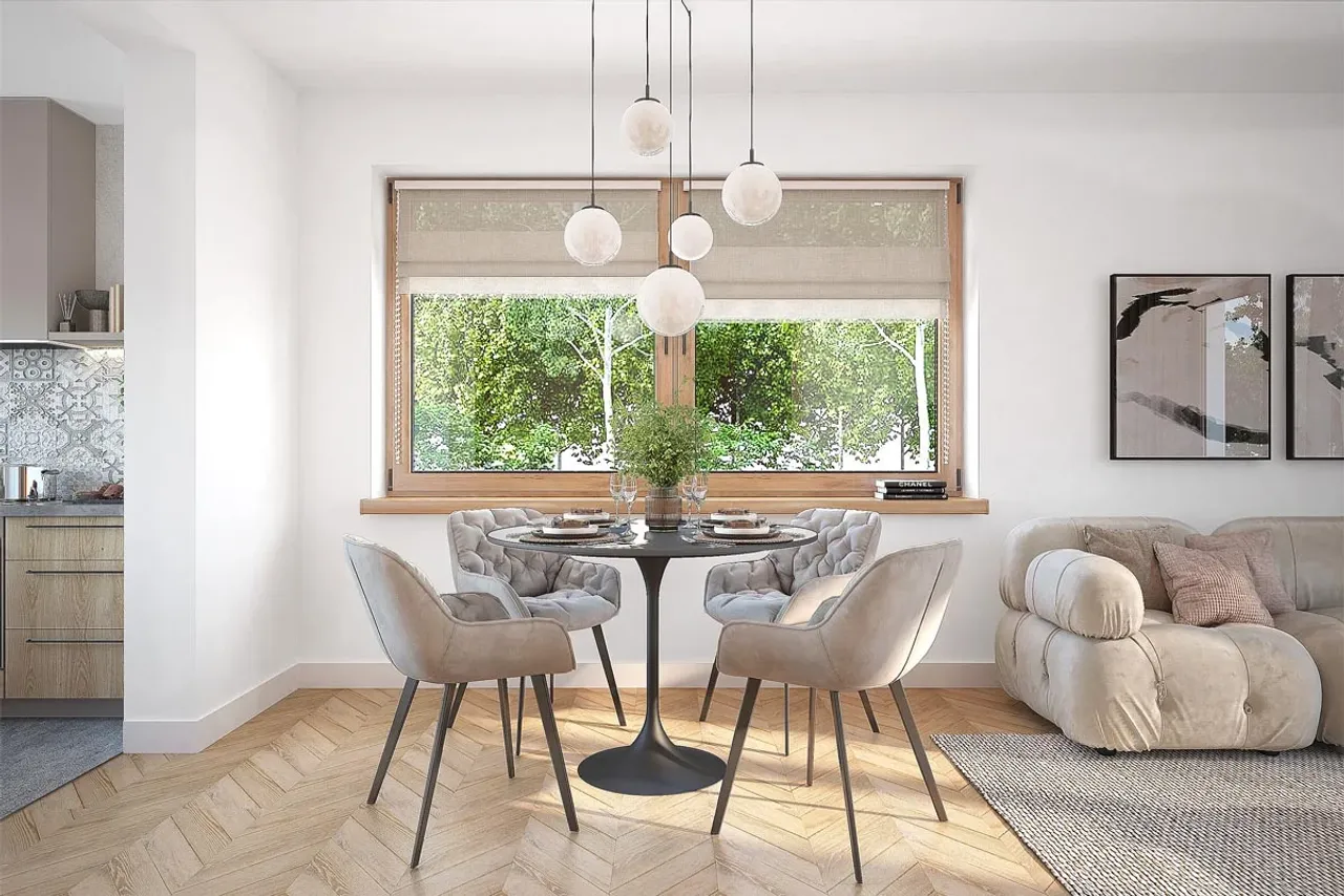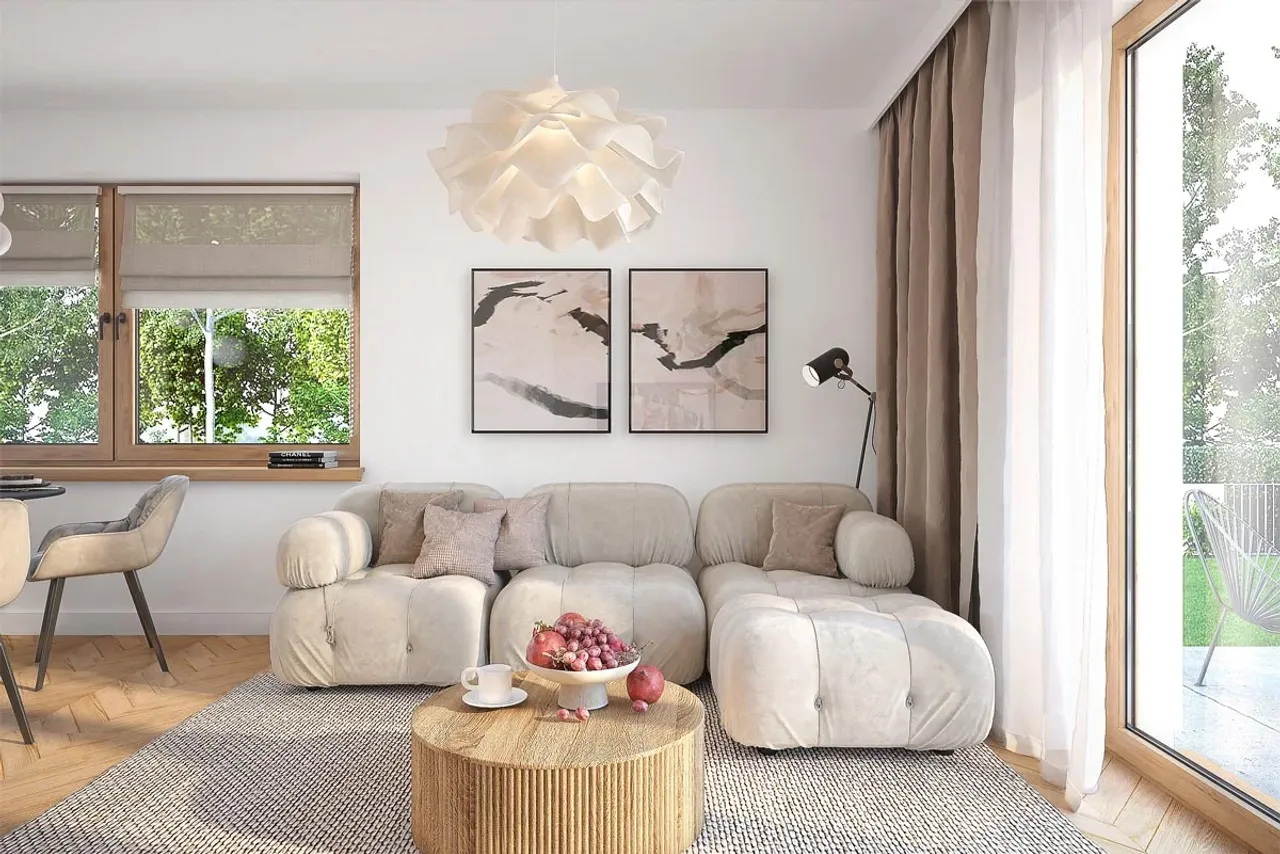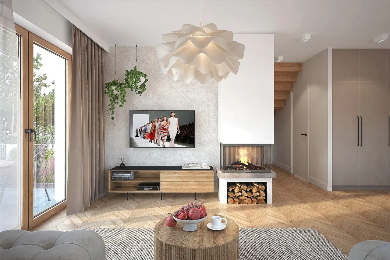 Projekt przewiduje ogrzewanie gazowe lub na paliwo stałe, co pozwala na elastyczny wybór rozwiązań instalacyjnych, dostosowanych do potrzeb i możliwości inwestora. Sercem dziennej części domu jest salon z miejscem na kominek. Dzięki temu centralny punkt wnętrza nabiera wyjątkowej atmosfery i wspiera efektywne rozprowadzanie ciepła w sezonie jesienno-zimowym.