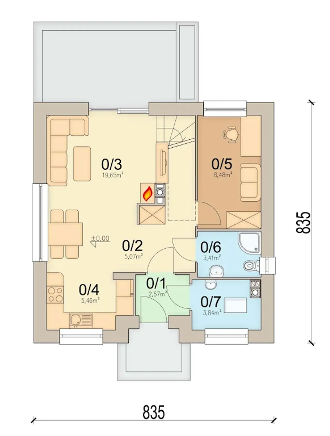 Konstrukcja oparta na technologii murowanej gwarantuje nie tylko trwałość, ale także bardzo dobre właściwości termoizolacyjne. Nośne i działowe ściany z pustaków ceramicznych oraz żelbetowe fundamenty zwiększają odporność domu na czynniki zewnętrzne. Rozwiązania takie jak kominek w projekcie wprowadzają przytulną atmosferę i dodatkowe źródło ciepła.