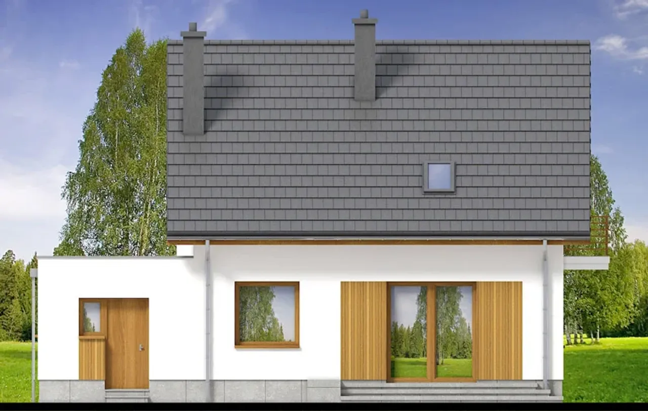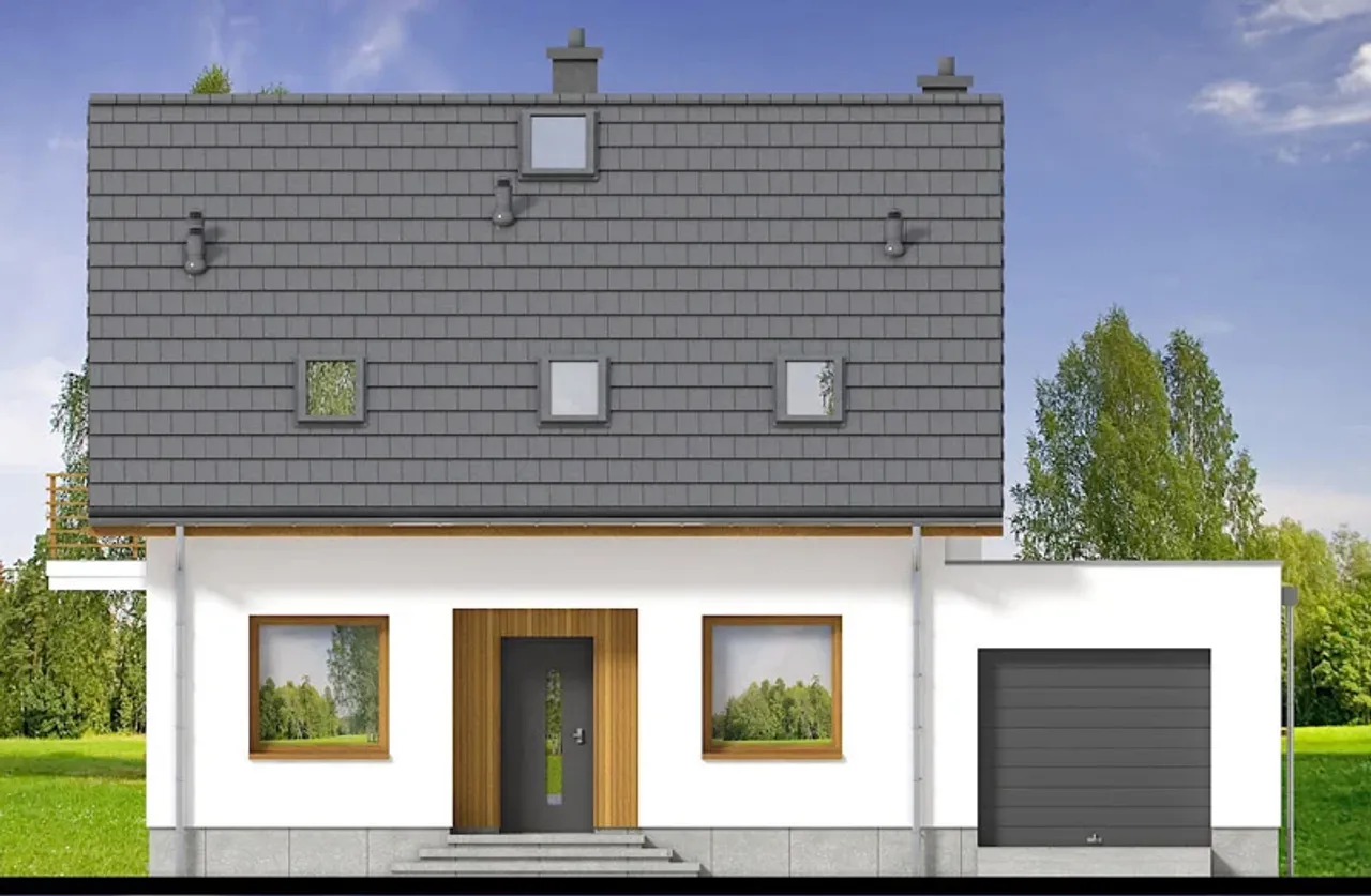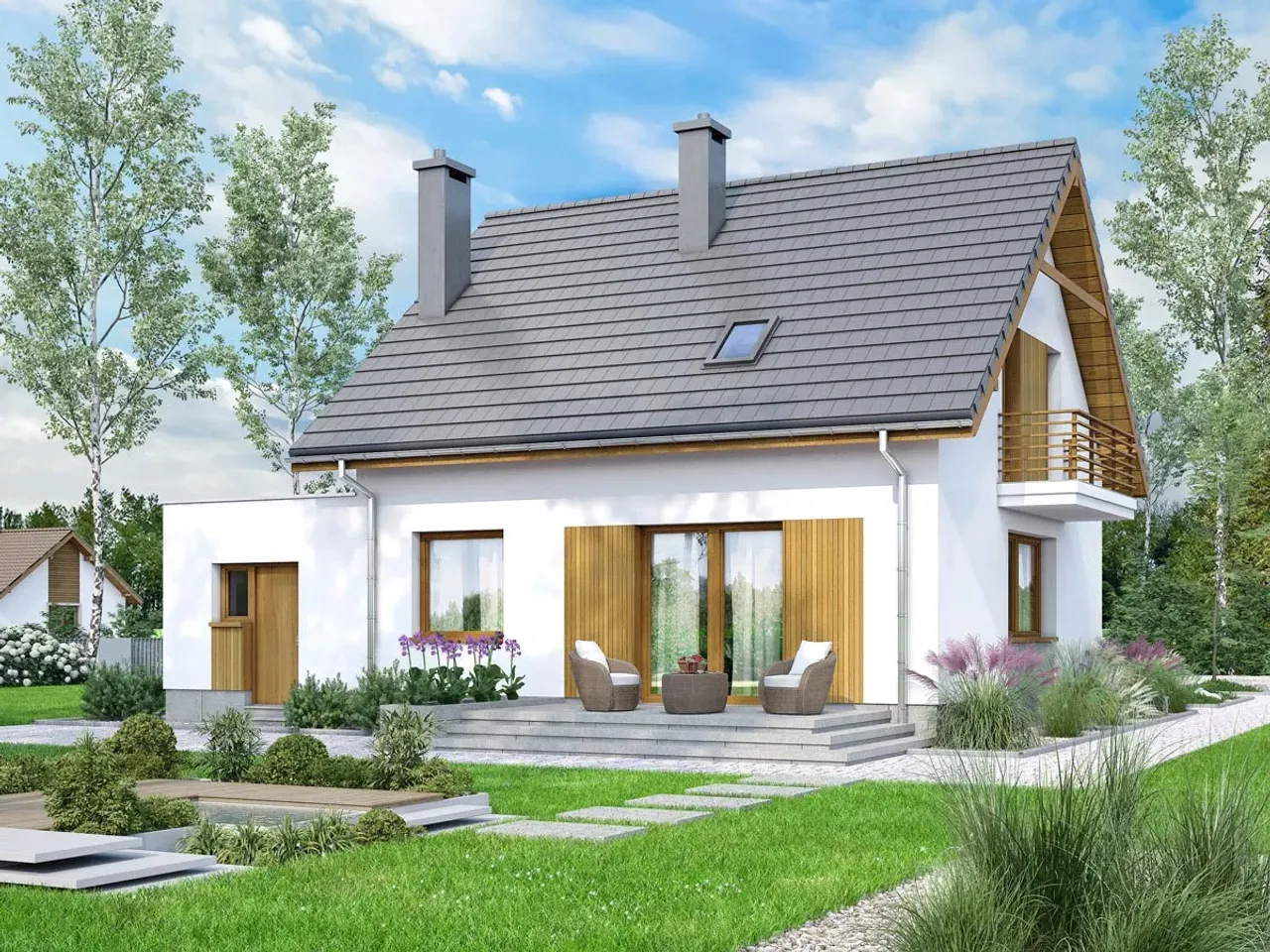 Projekt Monte 5 to dom, który wyróżnia się energooszczędnym, nowoczesnym podejściem do organizacji przestrzeni. Parterowa konstrukcja z funkcjonalnym poddaszem doskonale sprawdza się na działkach z wjazdem od południa lub wschodu, podkreślając równoległe ustawienie kalenicy względem drogi. Dach dwuspadowy o znacznym kącie nachylenia (40°) nadaje budynkowi atrakcyjny wygląd, a drewniana więźba dachowa wraz z trwałym pokryciem z dachówki ceramicznej lub betonowej sprawiają, że budynek służy przez długie lata.