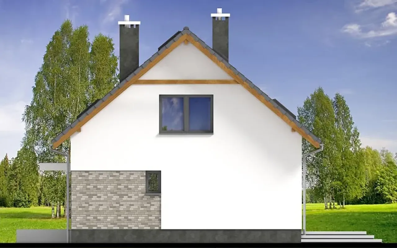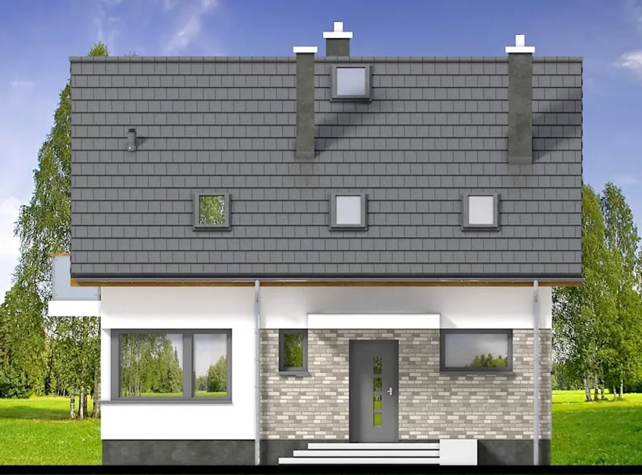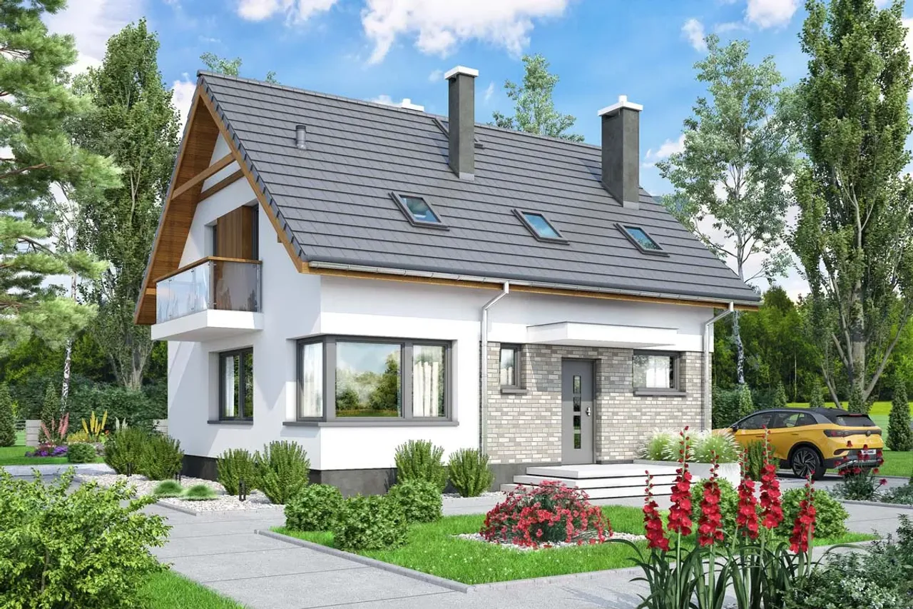 Na parterze zorganizujesz wygodną strefę dzienną, a poddasze bez problemu zamienisz na zaciszne przestrzenie do pracy lub nauki. Układ 5 pokoi pozwala elastycznie zaplanować sypialnie, domowe biuro, pokój hobby czy kącik telewizyjny. Kominek w projekcie stanowi doskonałe miejsce do spędzania wspólnych wieczorów, tworzy domowy klimat nawet w chłodne dni.