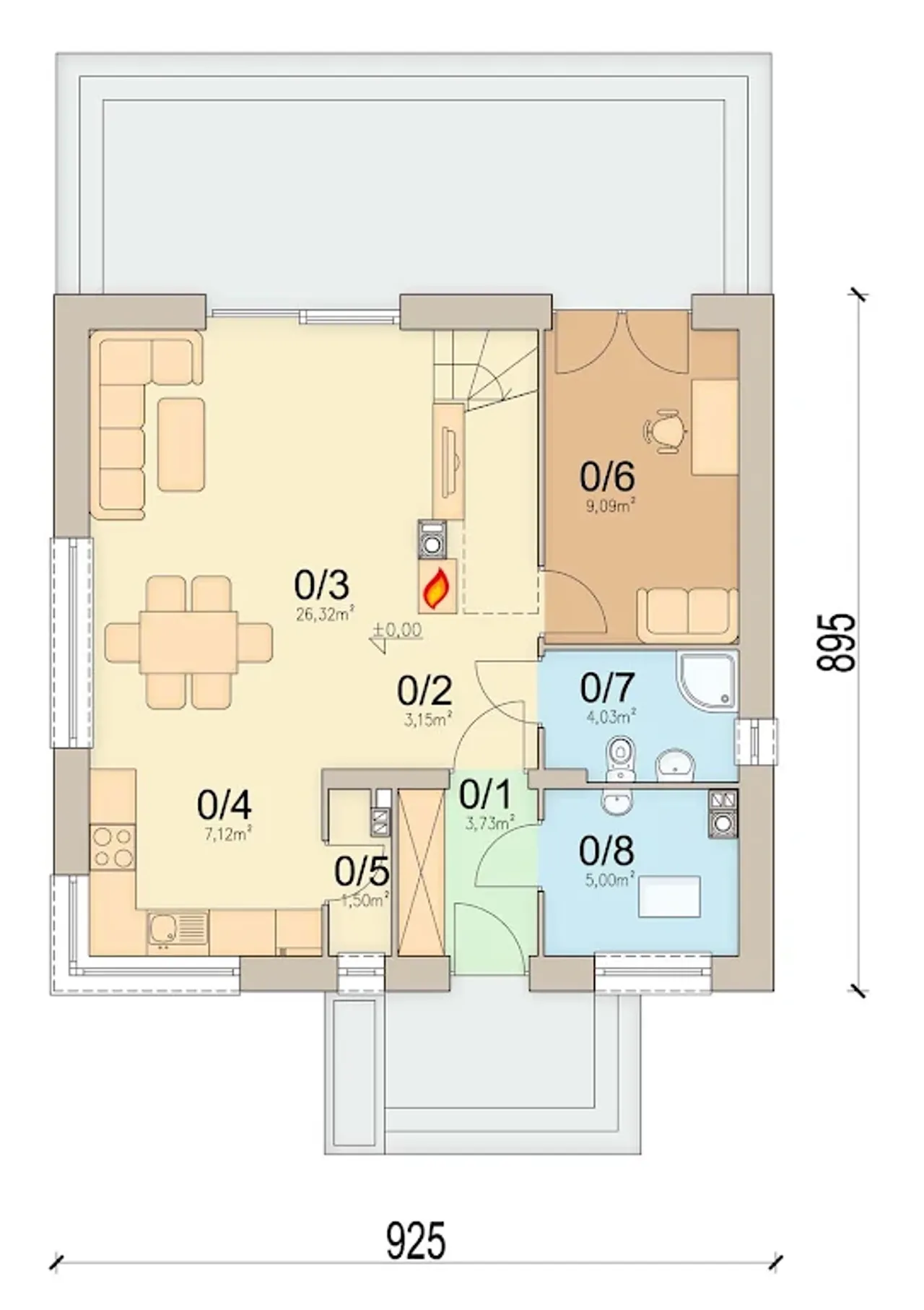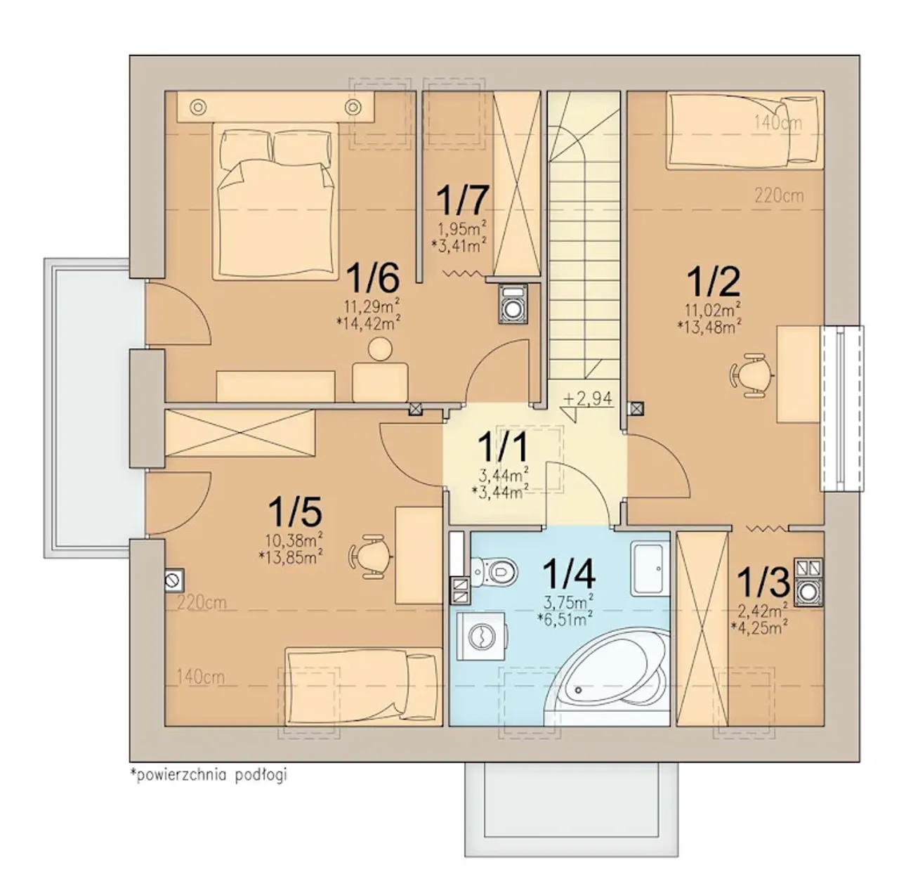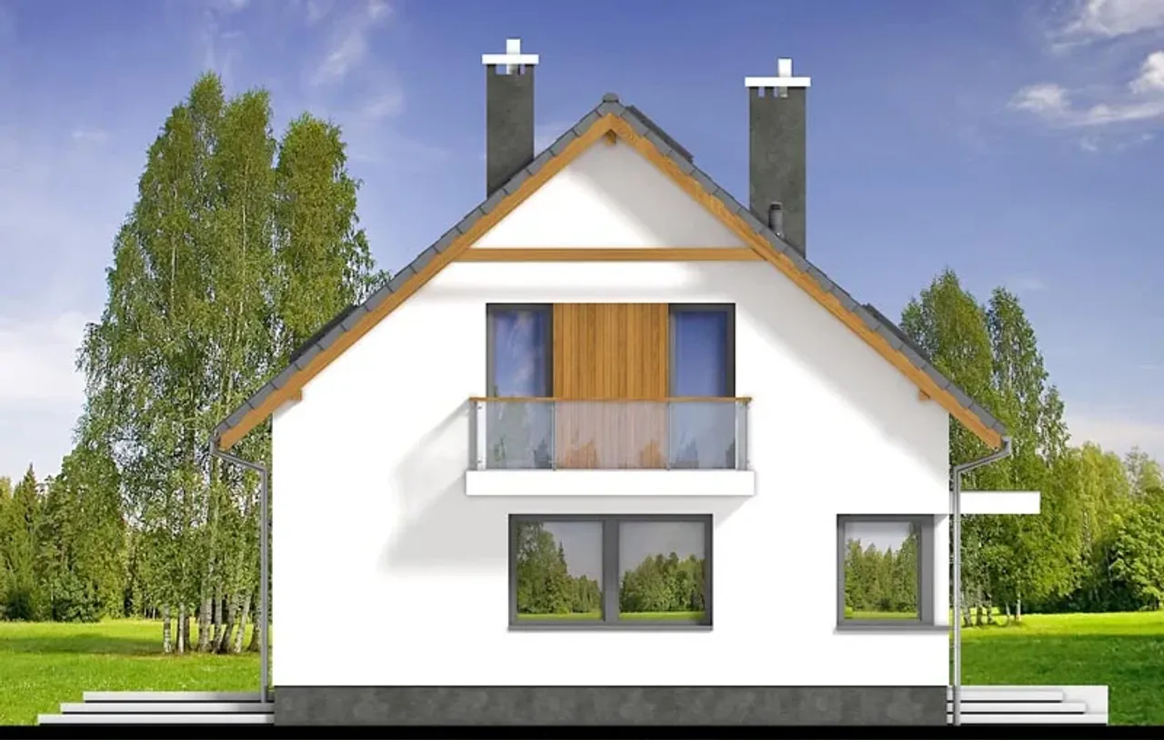 Na parterze zorganizujesz wygodną strefę dzienną, a poddasze bez problemu zamienisz na zaciszne przestrzenie do pracy lub nauki. Układ 5 pokoi pozwala elastycznie zaplanować sypialnie, domowe biuro, pokój hobby czy kącik telewizyjny. Kominek w projekcie stanowi doskonałe miejsce do spędzania wspólnych wieczorów, tworzy domowy klimat nawet w chłodne dni.