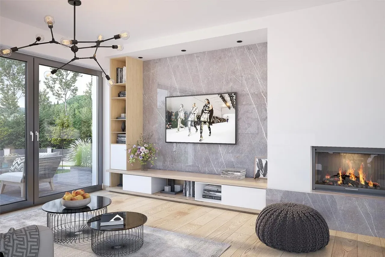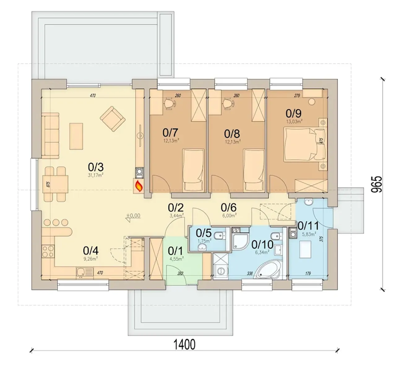 Parterowy układ projektu sprzyja wygodnemu użytkowaniu - wszystkie pomieszczenia znajdują się na jednym poziomie. W centralnej części domu znajduje się przestronny salon z klimatycznym kominkiem, zaprojektowanym z myślą o wspólnym spędzaniu czasu. Naturalne materiały - ceramiczne pustaki, żelbetowe fundamenty, drewniana konstrukcja dachu oraz solidne pokrycie dachówką betonową lub ceramiczną - gwarantują długowieczność budynku i wysokie parametry termoizolacyjne.