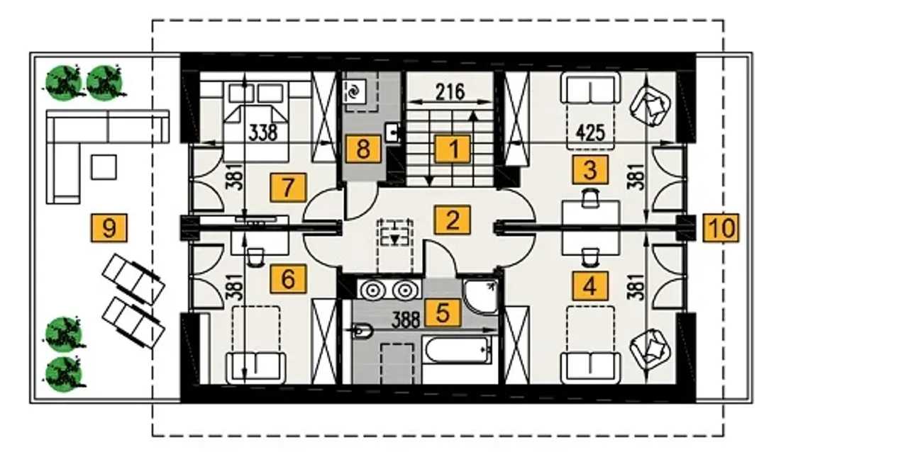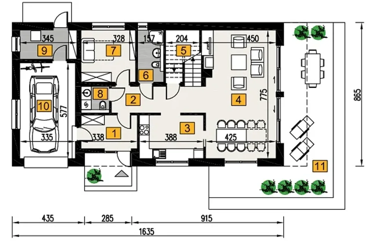 Wypełnij formularz i otrzymaj rysunki w pdf z dokładnymi wymiarami budynku i pomieszczeń (długość, szerokość, wysokość) dla projektu Nasz pomysł (aranżacja 1) - A105G1+AR1