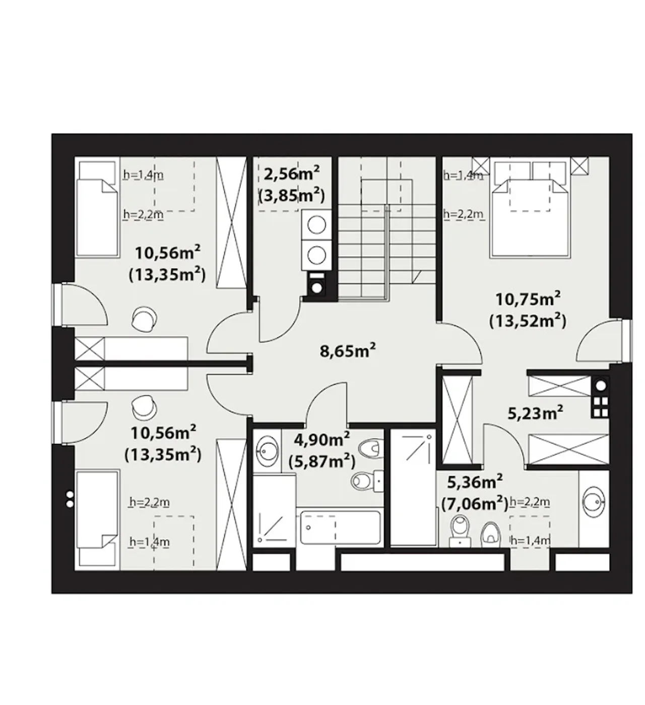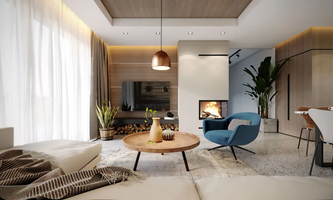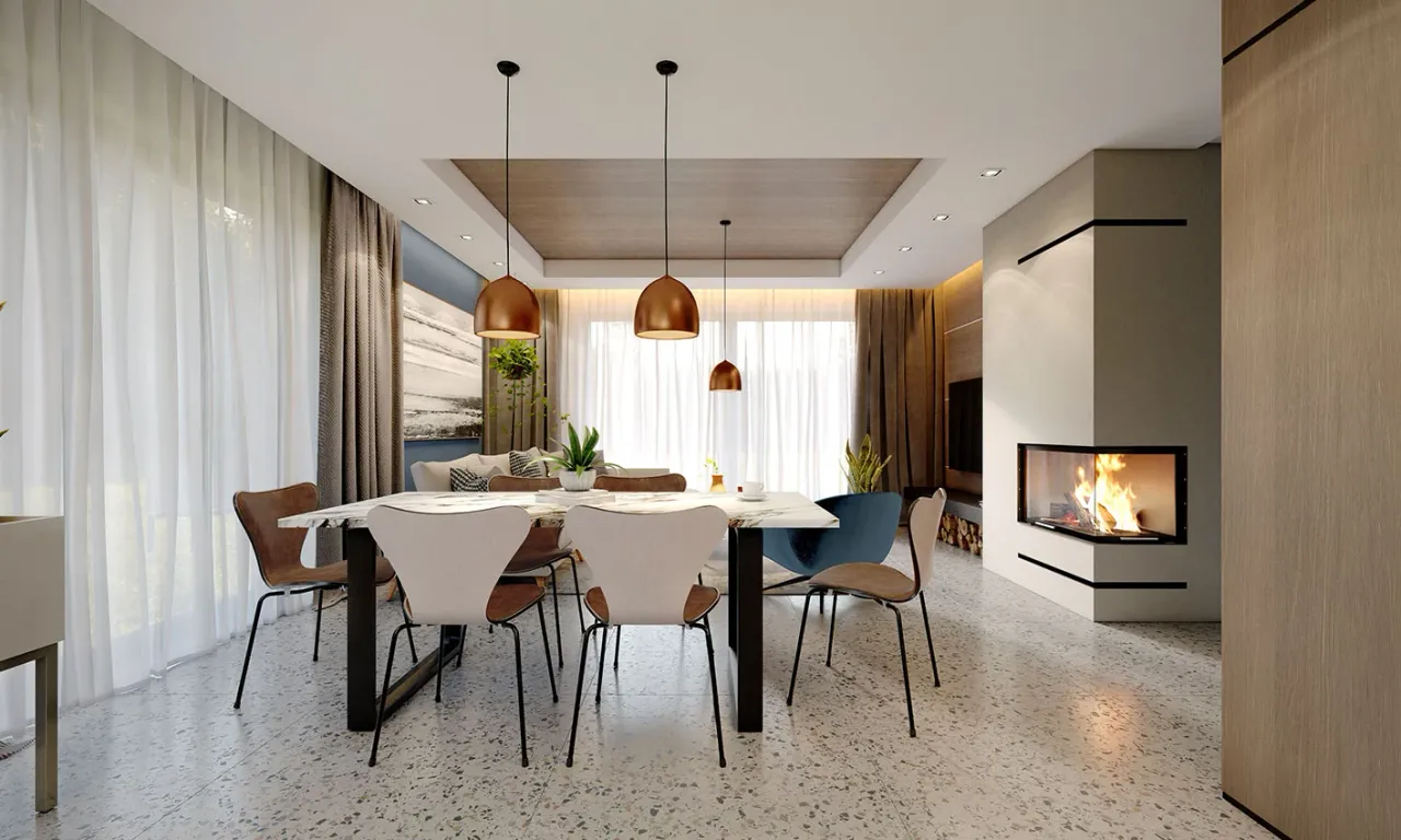 Projekt przewiduje pięć ustawnych pokoi, co sprzyja wygodnej organizacji strefy dziennej oraz prywatnej dla każdego z domowników. Otwarty salon z miejscem na kominek sprzyja rodzinnej integracji oraz odprężeniu w długie wieczory. Garaż umieszczony z przodu budynku ułatwia codzienny dojazd i przechowywanie pojazdów. Dom zaplanowano z myślą o rodzinie, która lubi aktywnie spędzać czas, ceni bliskość zieleni oraz nowoczesne, sprawdzone rozwiązania architektoniczne.
