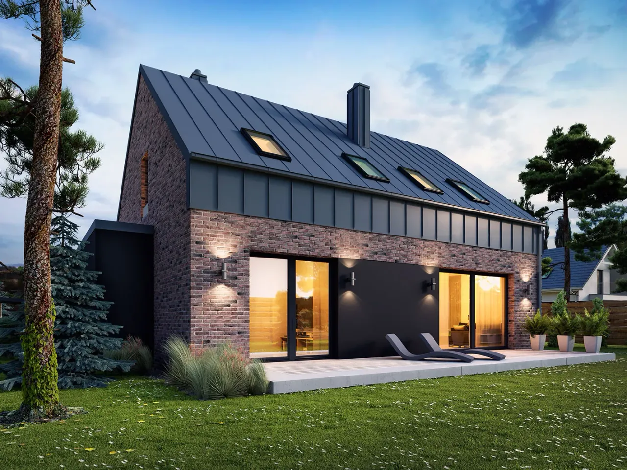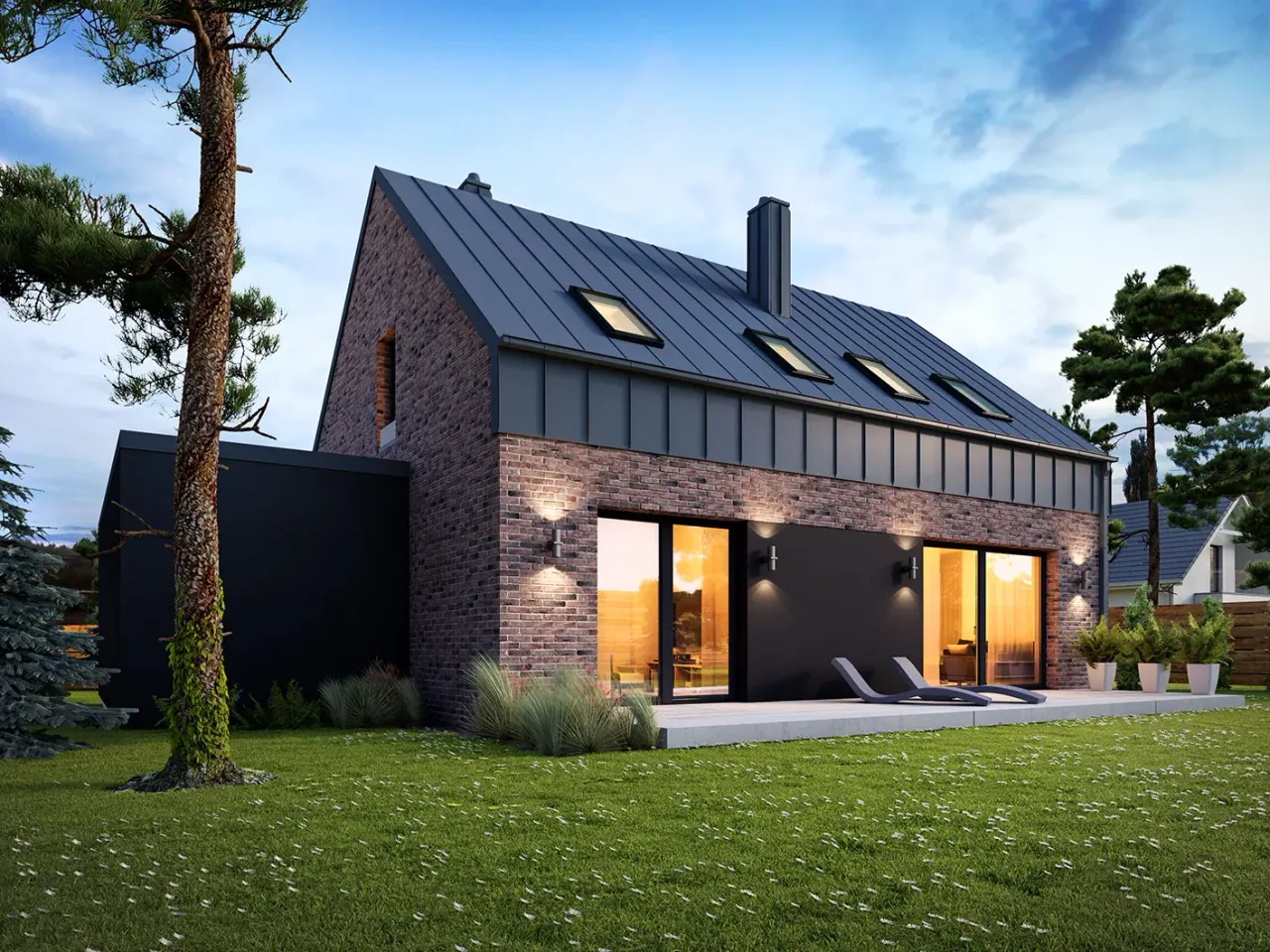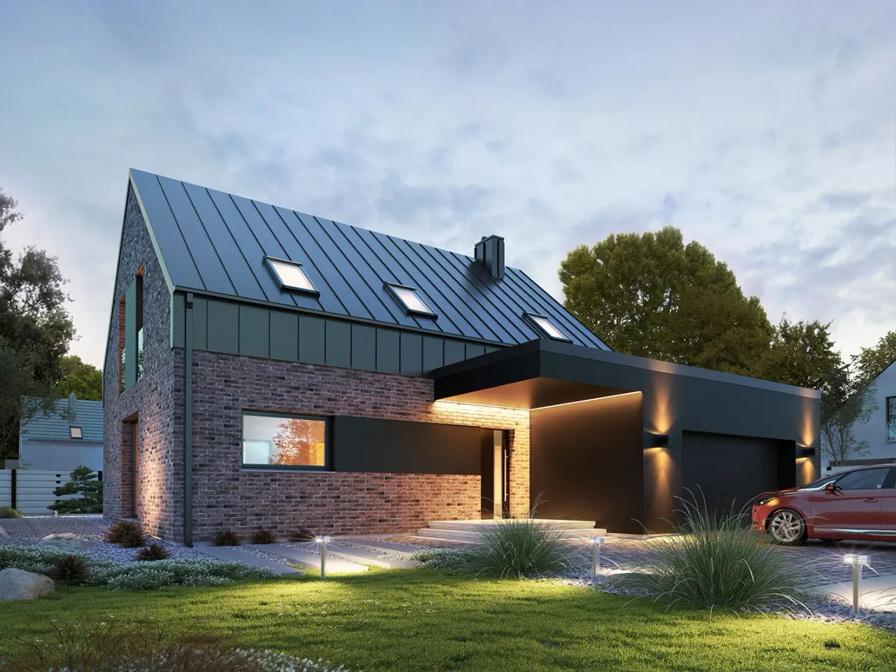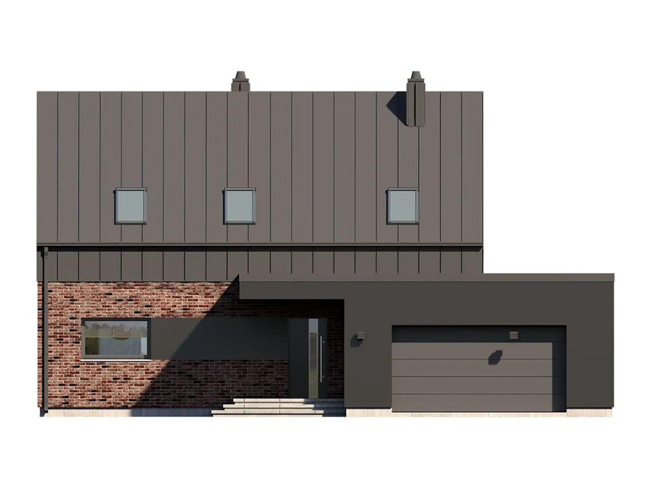 Projekt Nemini 3 to dom o zwartej i nowoczesnej bryle, doskonale wpisującej się w współczesne wymagania estetyczne. Budynek został zaprojektowany jako parterowy z funkcjonalnym poddaszem, które daje swobodę zagospodarowania. Konstrukcja murowana, ściany z pustaka ceramicznego docieplone styropianem oraz solidny żelbetowy strop umożliwiają wieloletnią trwałość i odporność na zmienne warunki atmosferyczne.