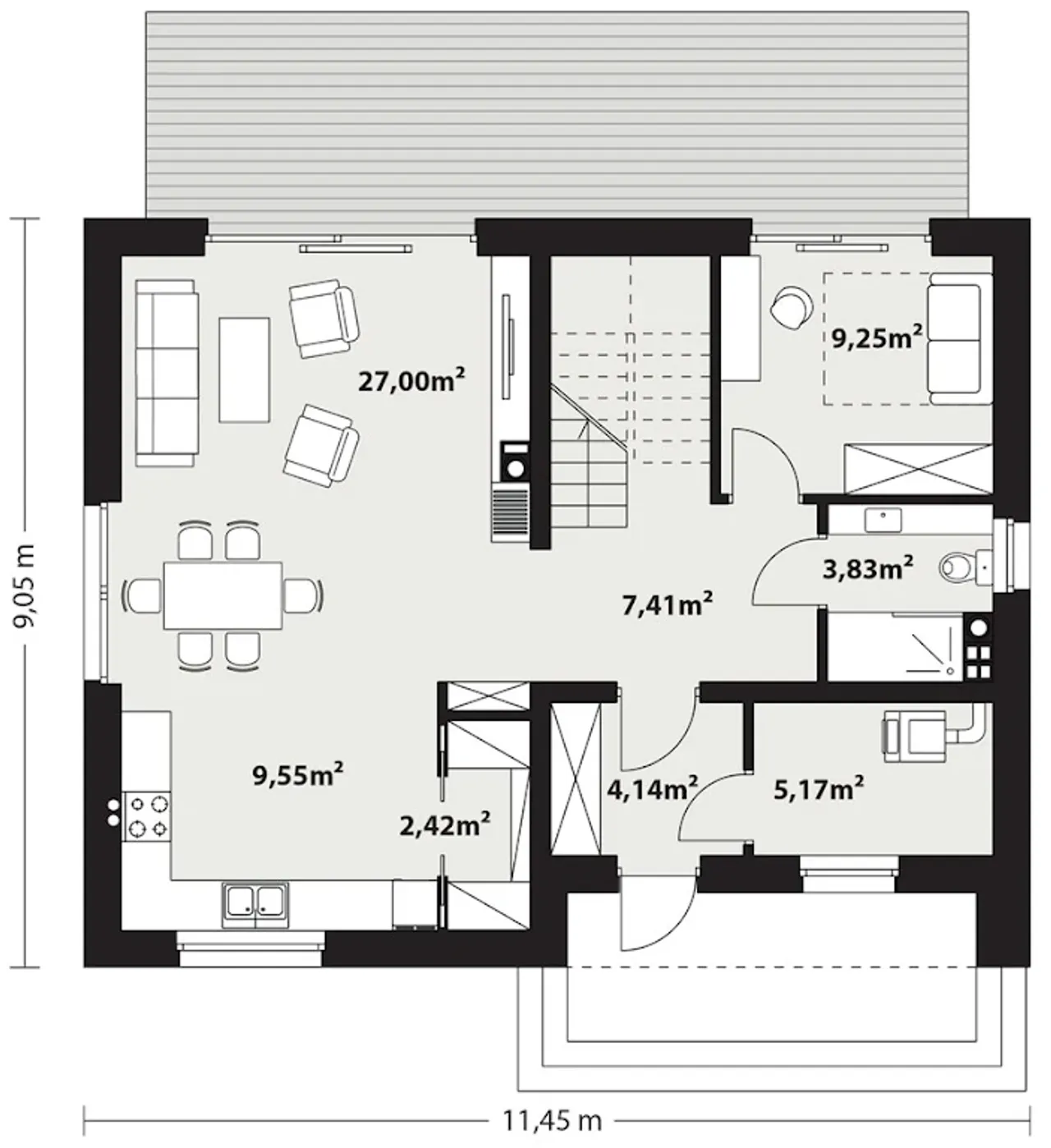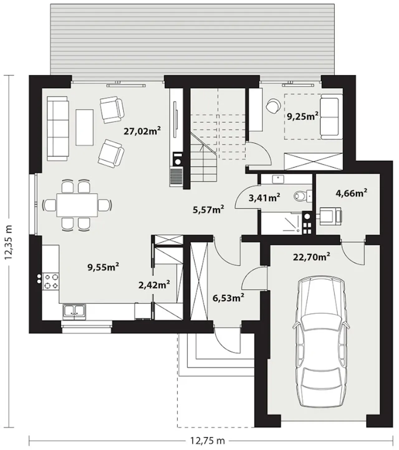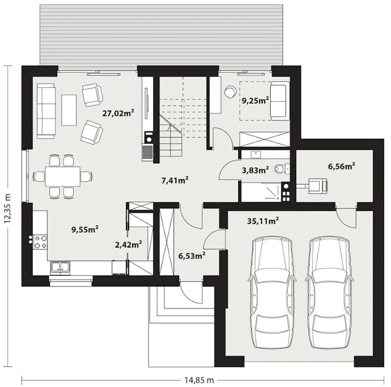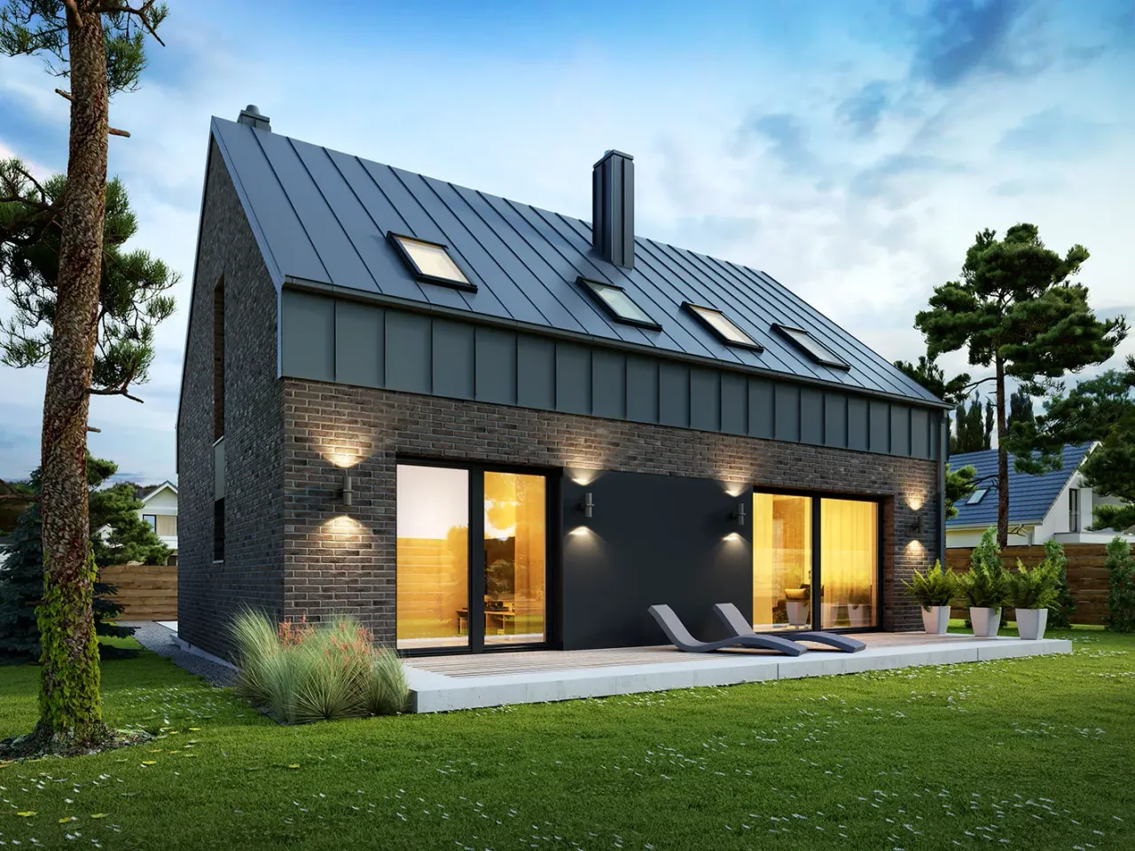 Projekt Nemini 3 to dom o zwartej i nowoczesnej bryle, doskonale wpisującej się w współczesne wymagania estetyczne. Budynek został zaprojektowany jako parterowy z funkcjonalnym poddaszem, które daje swobodę zagospodarowania. Konstrukcja murowana, ściany z pustaka ceramicznego docieplone styropianem oraz solidny żelbetowy strop umożliwiają wieloletnią trwałość i odporność na zmienne warunki atmosferyczne.