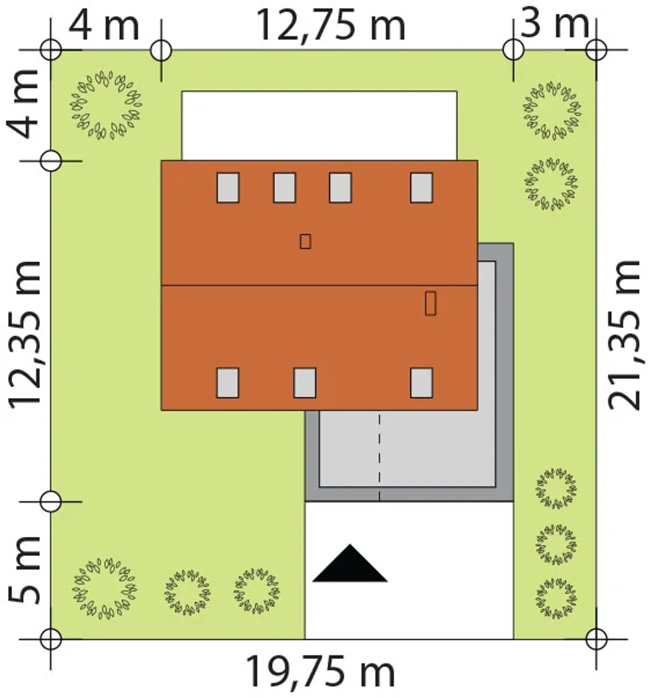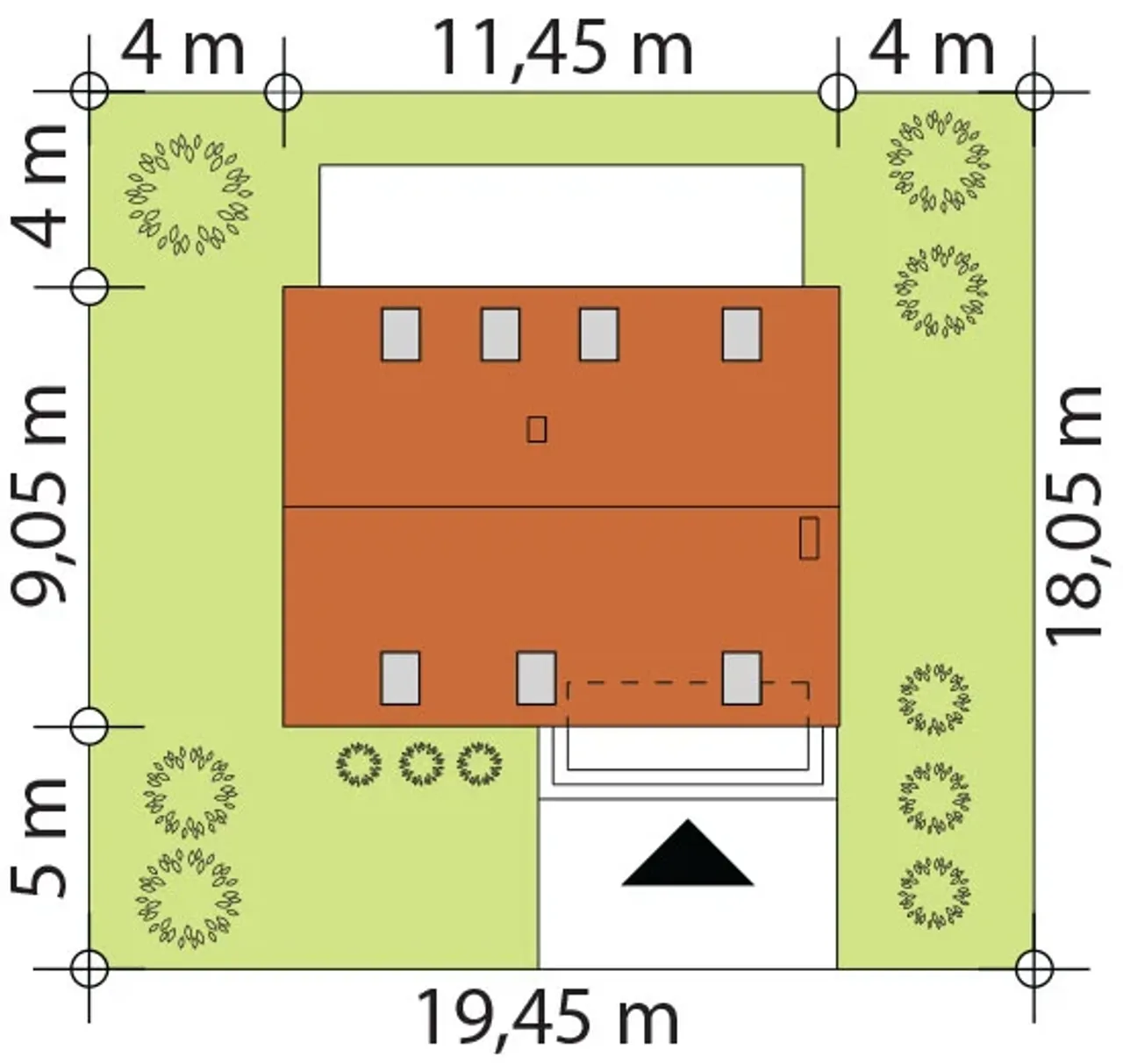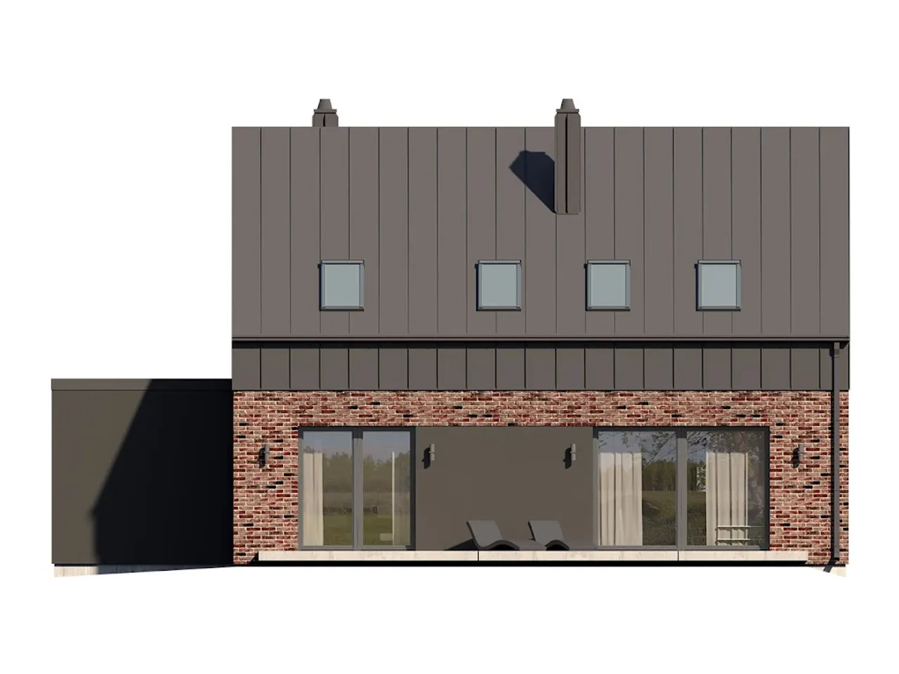 Dwuspadowy dach o kącie nachylenia 40 stopni może być pokryty trwałą dachówką ceramiczną lub blachodachówką, co podkreśla jego nowoczesny charakter oraz zapewnia skuteczną ochronę przed opadami. Precyzyjne wykończenie elewacji - płytka elewacyjna i wysokiej jakości tynk - nadają bryle ponadczasowej elegancji i pozwalają na harmonijne wkomponowanie w różnorodne otoczenie.