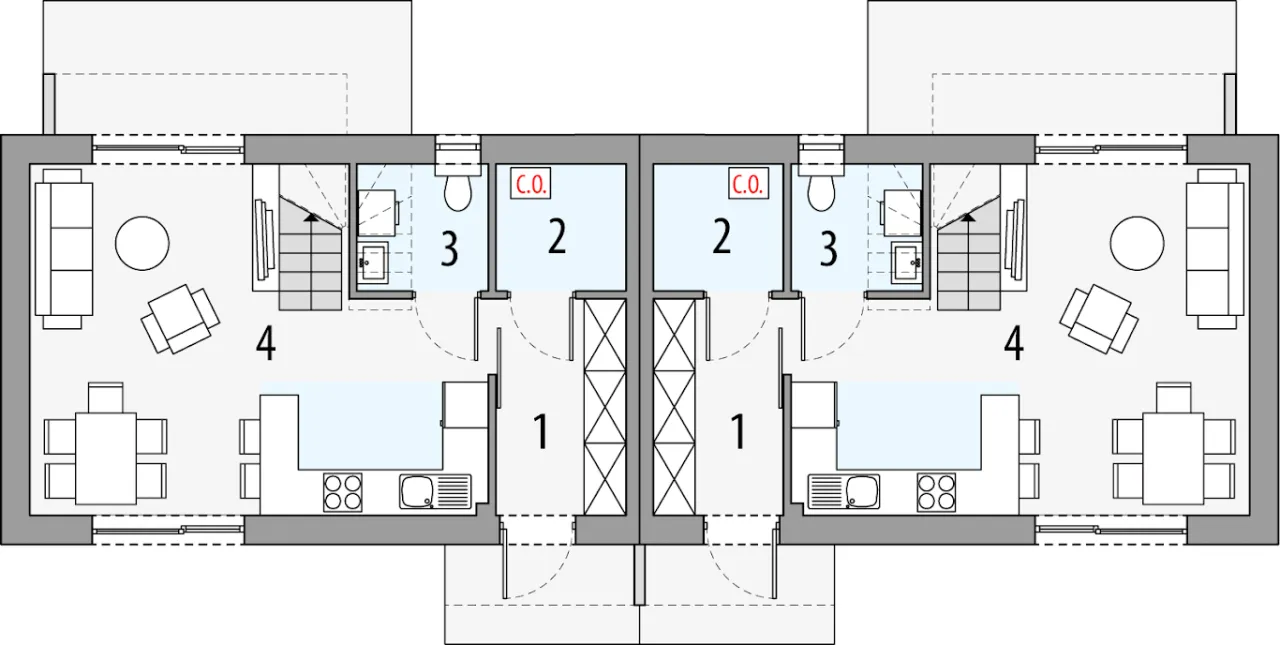 - Dwurodzinny układ bliźniaczy: Umożliwia wygodne zamieszkanie dwóch rodzin na jednej posesji, z wyraźnym rozdziałem stref życia.