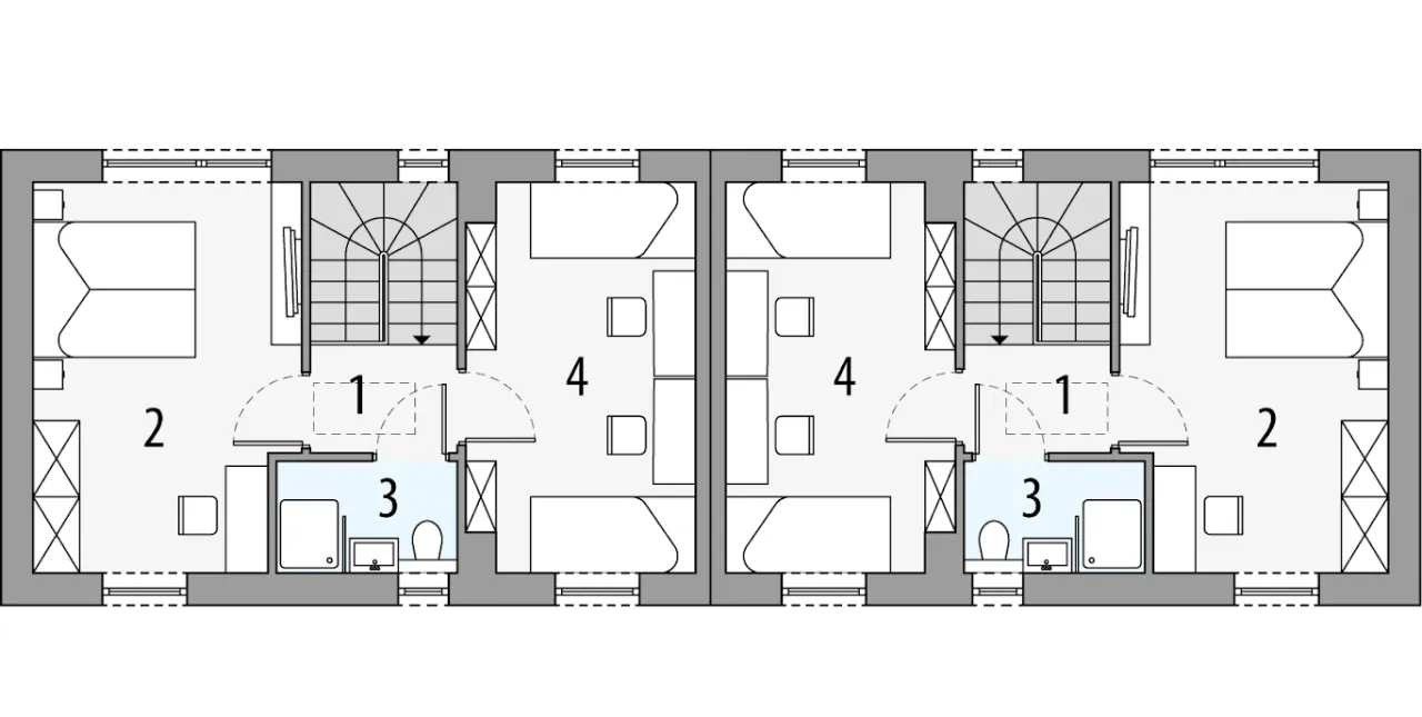 Dwurodzinny charakter budynku to również interesująca opcja dla osób planujących dom pod wynajem długoterminowy. Dwa niezależne segmenty ułatwiają rozdzielenie najemców, a przejrzyste bryły piętrowe pozwalają elastycznie aranżować wnętrza, dostosowując je do różnych grup odbiorców - od młodych par po rodziny z dziećmi.