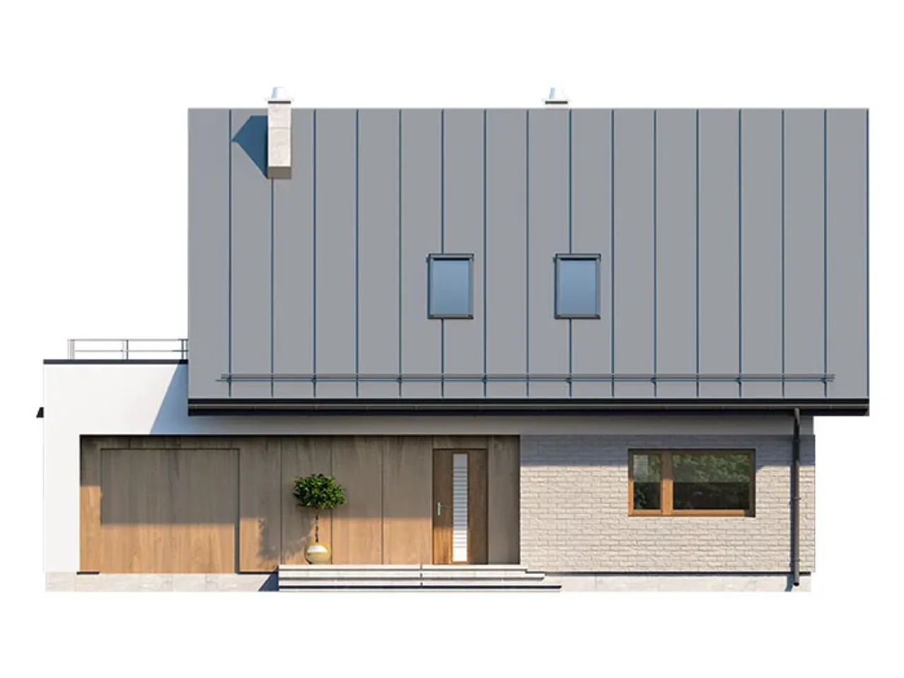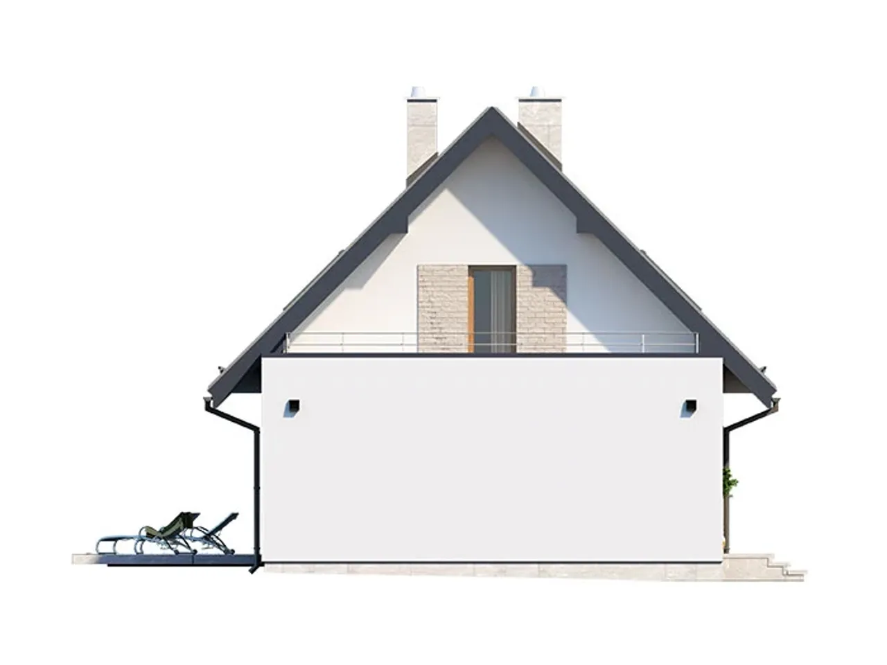 Dom zaprojektowany na bazie bryły prostokąta urzeka prostotą i elegancją, jednocześnie oferując 5 przestronnych pokoi na dwóch poziomach. Dwuspadowy dach o kącie nachylenia 45 stopni pozwala na sprawną adaptację poddasza i zwiększa możliwości aranżacji wnętrz. Dzięki żelbetowemu stropowi cała konstrukcja zyskuje trwałość i stabilność, a nowoczesne rozwiązania technologiczne wpływają na zoptymalizowanie kosztów eksploatacyjnych.