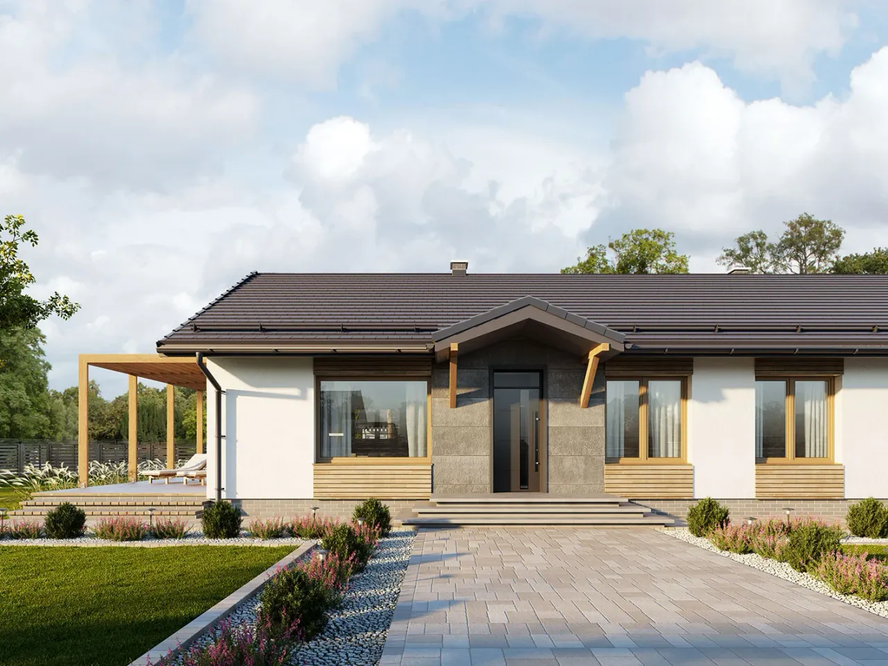 Prosty, nowoczesny styl oraz dach o kącie nachylenia 30° sprawiają, że dom Neo doskonale komponuje się z zabudową podmiejską i działkami o różnej orientacji względem drogi. Równoległa kalenica to praktyczny detal ułatwiający rozmieszczenie na działce. Dwuspadowy dach dostępny jest zarówno w wersji dachówki, jak i blachodachówki, oferując idealną ochronę przed zmienną aurą i atrakcyjny wizualnie efekt.