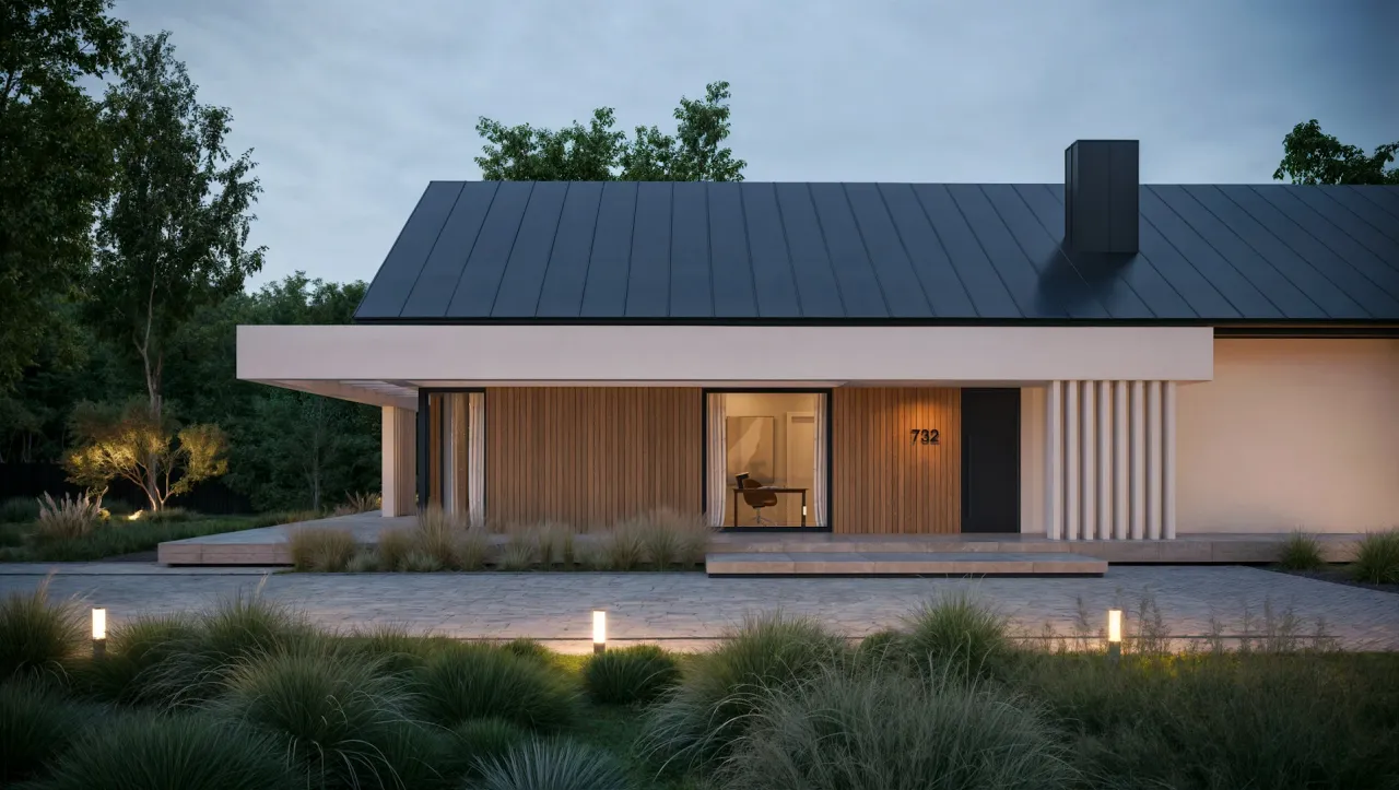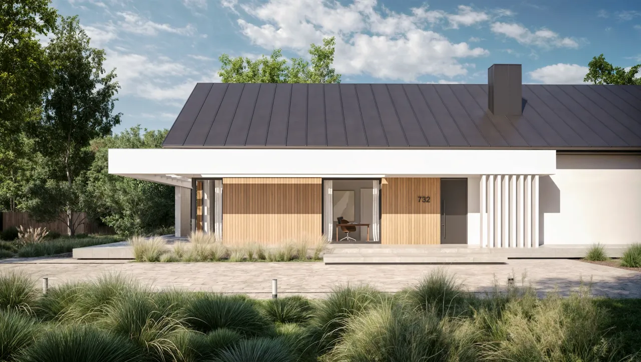 Projekt domu New House 732 idealnie wpisuje się w potrzeby rodziny ceniącej sobie nowoczesność połączoną z funkcjonalnością. Prosta, ale wyrazista bryła budynku oraz duże przeszklenia nadają tej nieruchomości lekkości i nowoczesnego charakteru. Bardzo interesującym rozwiązaniem jest zintegrowany z domem garaż, który nie tylko podnosi estetykę całego obiektu, ale również jest bardzo praktyczny. Przemyślany układ pomieszczeń zapewnia komfort użytkowania i możliwość oddzielenia strefy dziennej od nocnej, co jest znaczącym atutem dla rodziny z dziećmi. Ponadto, duże przeszklenia w salonie zapewniają doskonałe doświetlenie wnętrz oraz widok na ogród, co potęguje poczucie przestrzeni i kontaktu z naturą. Projekt ten na pewno spełni oczekiwania osób poszukujących nowoczesności połączonej z funkcjonalnością.