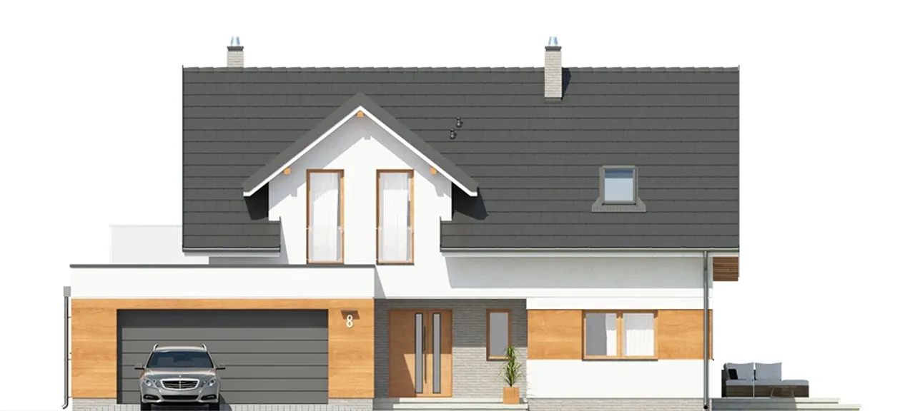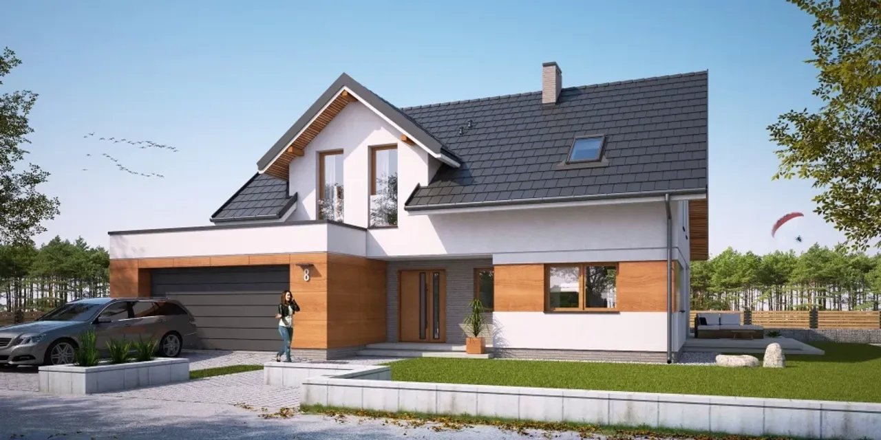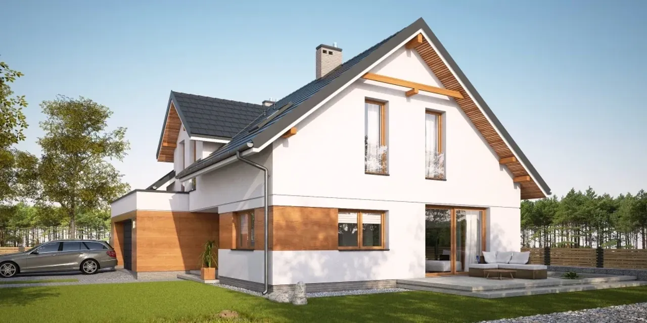 Uniwersalny dach dwuspadowy z lukarnami, podwójny garaż z bezpośrednim wejściem do części mieszkalnej i żelbetowe stropy wpisują projekt w aktualne trendy budownictwa. Wysokiej klasy materiały oraz solidne rozwiązania konstrukcyjne tworzą bazę, która sprawdzi się przez lata, a innowacyjne elementy - jak rolety zewnętrzne i strefowanie funkcji - odpowiadają na nowoczesne potrzeby mieszkańców.