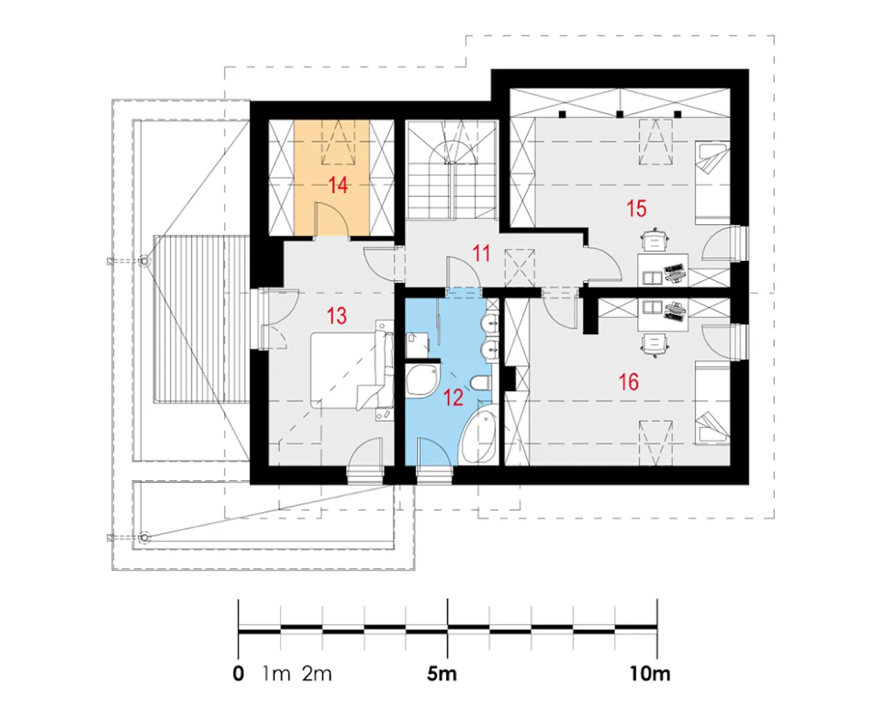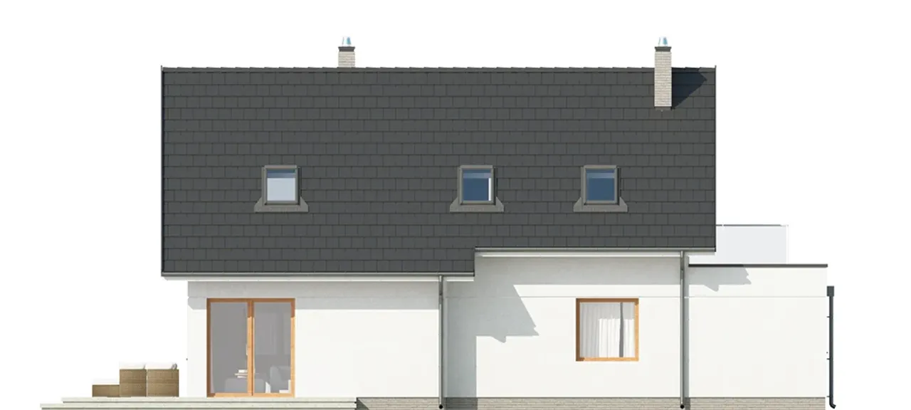 Dom jednorodzinny Nobilis I G2 cechuje parterowy układ z poddaszem użytkowym. Przemyślany kształt dachu dwuspadowego o kącie nachylenia 38°, oparty na drewnianej konstrukcji i pokryty dachówką ceramiczną, skutecznie odprowadza wodę, świetnie wpisując się w klimat polskich warunków. Dachowe lukarny pozwalają na lepsze doświetlenie i tworzą na poddaszu strefę komfortu, a także zwiększają powierzchnie funkcjonalne.
