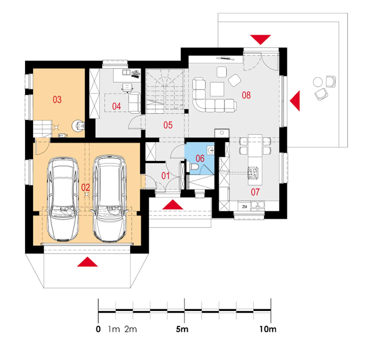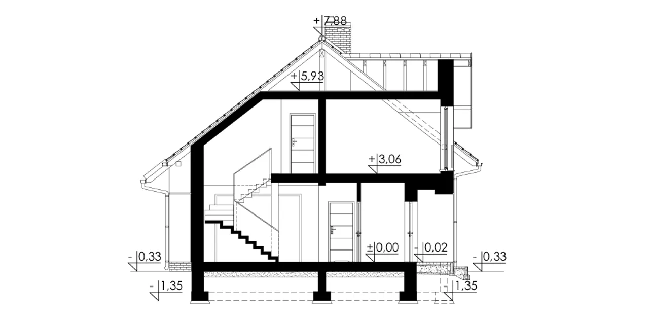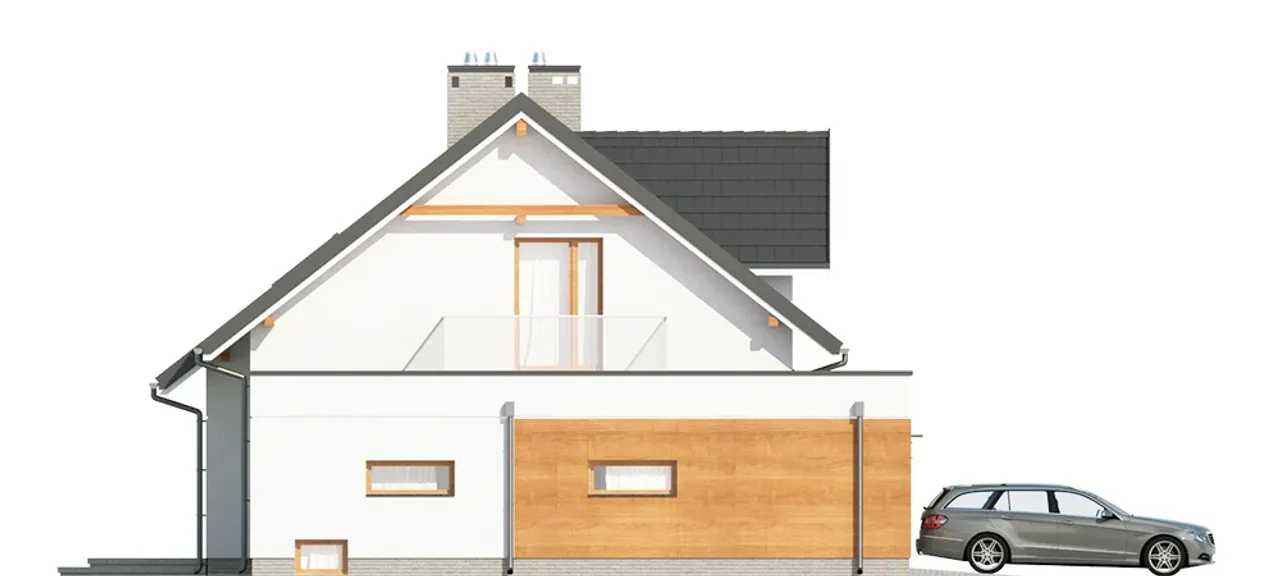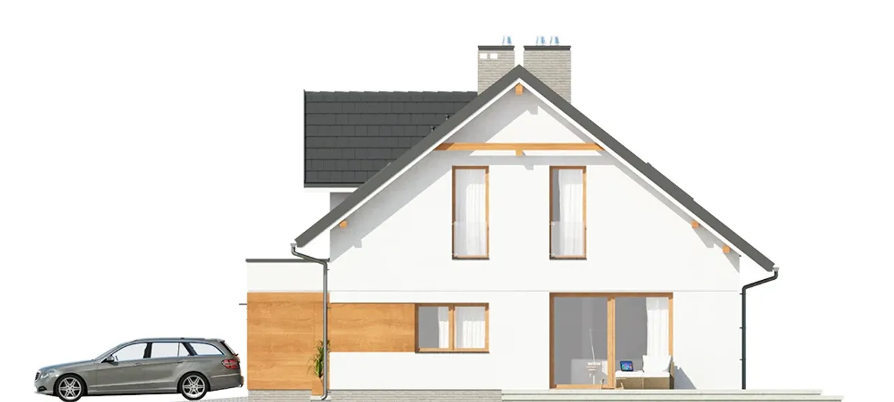 Nowoczesna stolarka PVC z segmentową bramą garażową oraz zastosowanie żelbetowych stropów i schodów to gwarancja trwałości na lata. Ściana kolankowa o wysokości do 90 cm pozwala korzystać z pełnej wysokości pomieszczeń na poddaszu. Dom jest bez podpiwniczenia, co znacząco upraszcza proces budowy i obniża koszty eksploatacji. Instalacja kotła gazowego lub na paliwo stałe umożliwia łatwe dopasowanie do własnych potrzeb grzewczych oraz elastyczne zarządzanie ogrzewaniem.