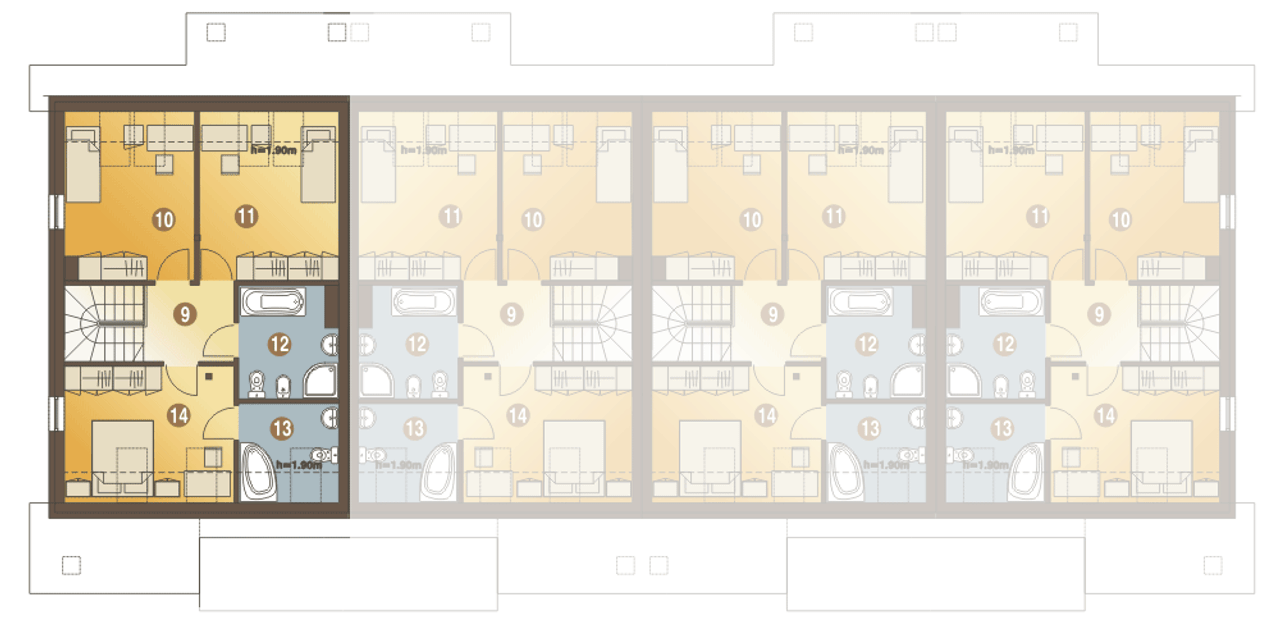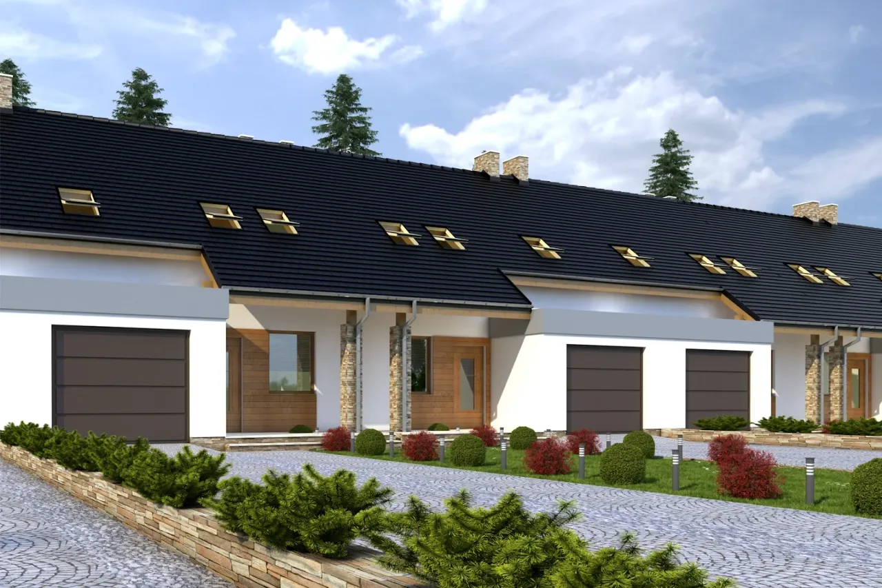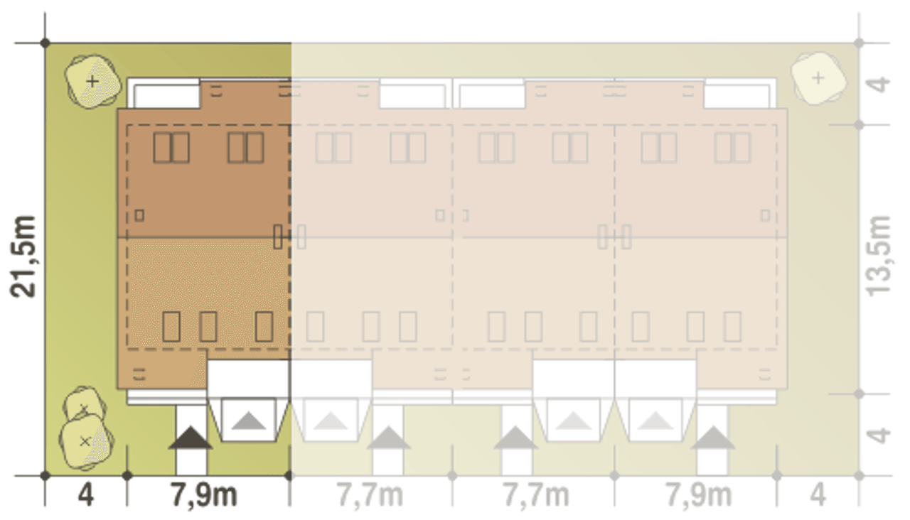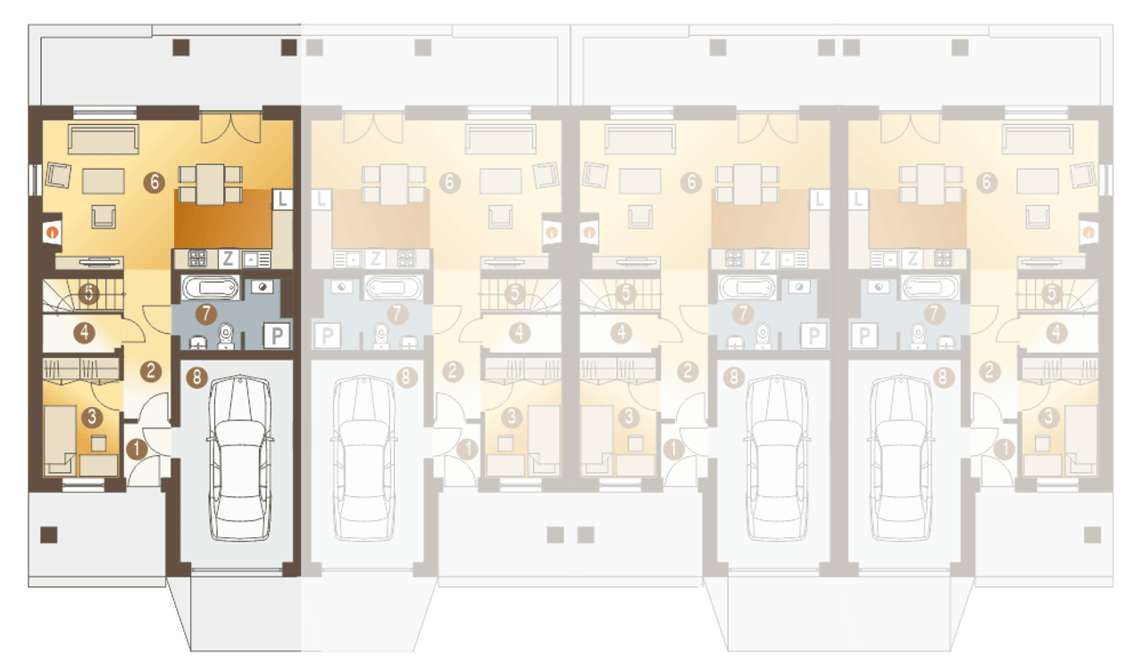 Wypełnij formularz i otrzymaj rysunki w pdf z dokładnymi wymiarami budynku i pomieszczeń (długość, szerokość, wysokość) dla projektu Norbert z garażem 1-st. szeregówka A-SZL