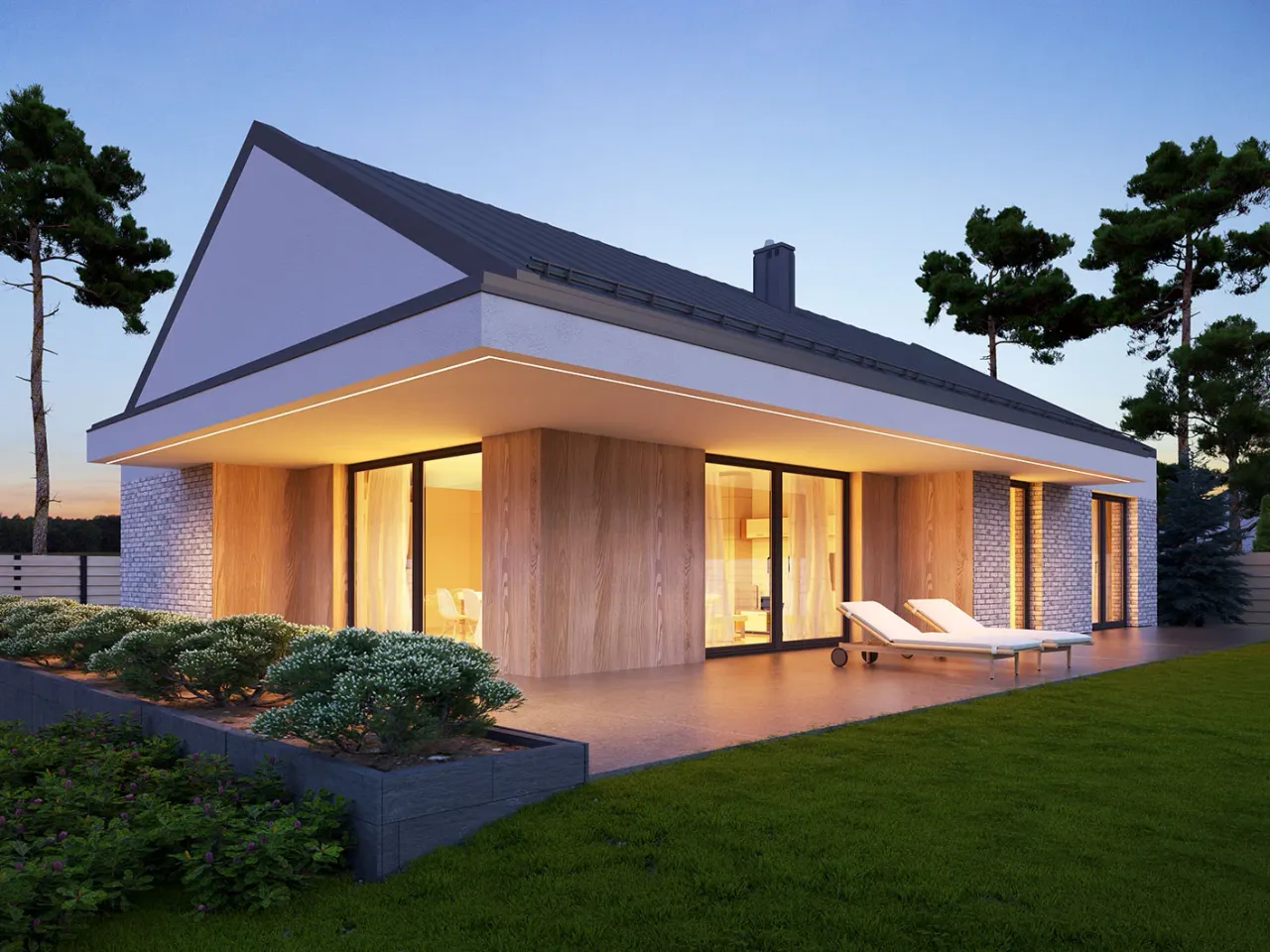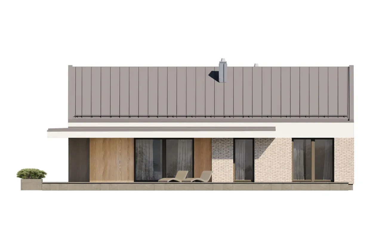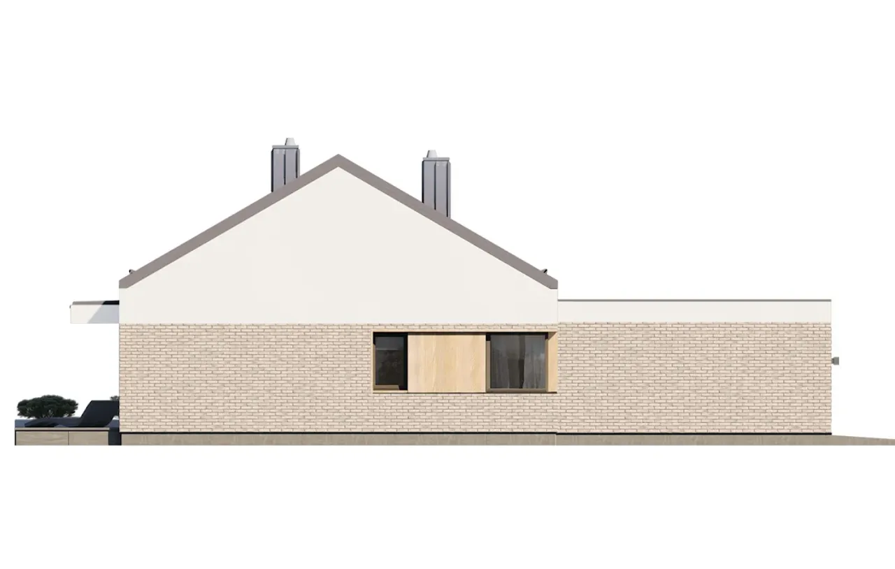 Dom Nori 2 powstaje w technologii tradycyjnej, czyli murowanej - strop żelbetowy oraz solidne ściany zewnętrzne (pustak ceramiczny plus styropian) gwarantują trwałość i bardzo dobrą izolację termiczną. Charakterystyczny dwuspadowy dach o kącie nachylenia 30° możesz wykończyć dachówką lub blachodachówką, osiągając tym samym spójny efekt wizualny dostosowany do krajobrazu.