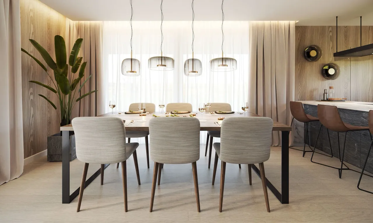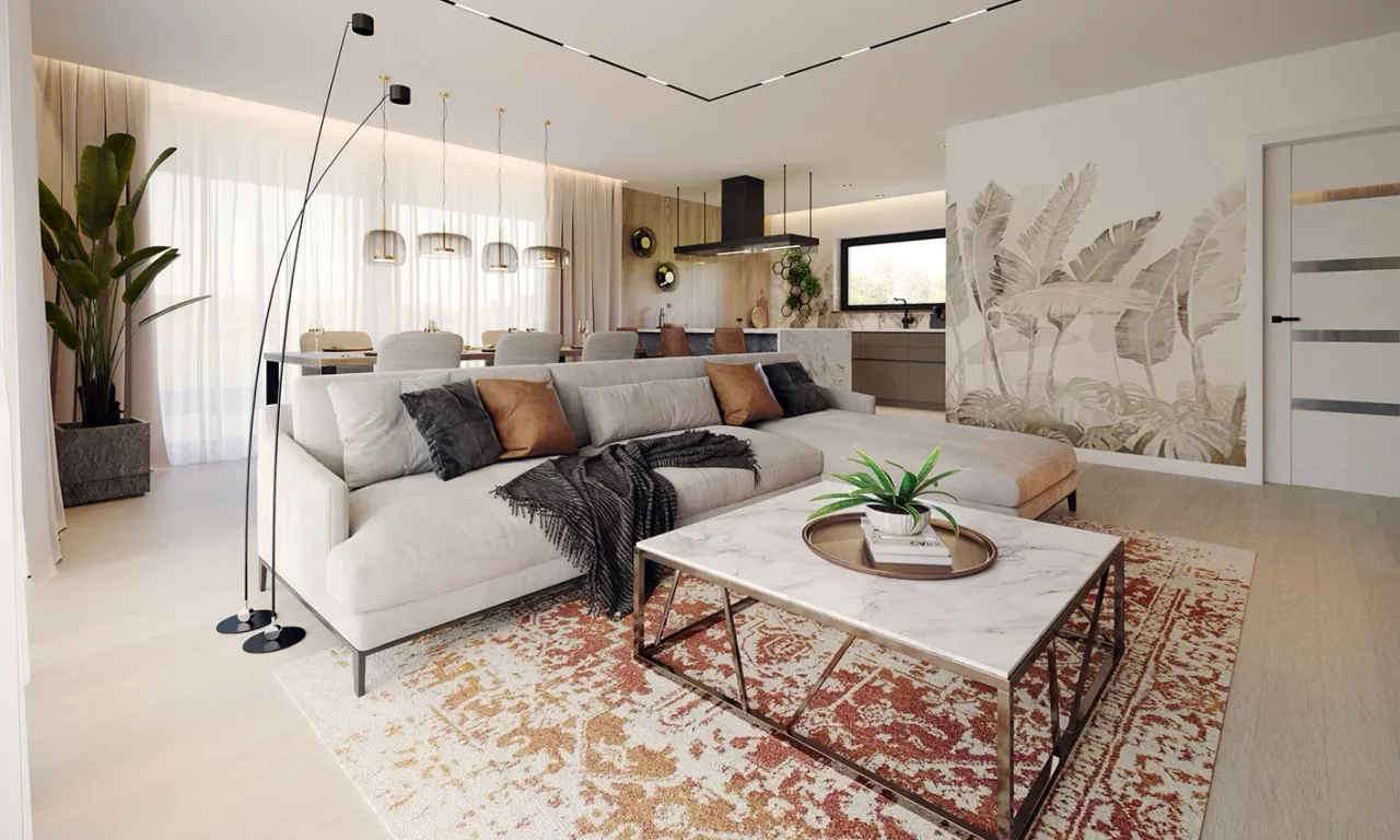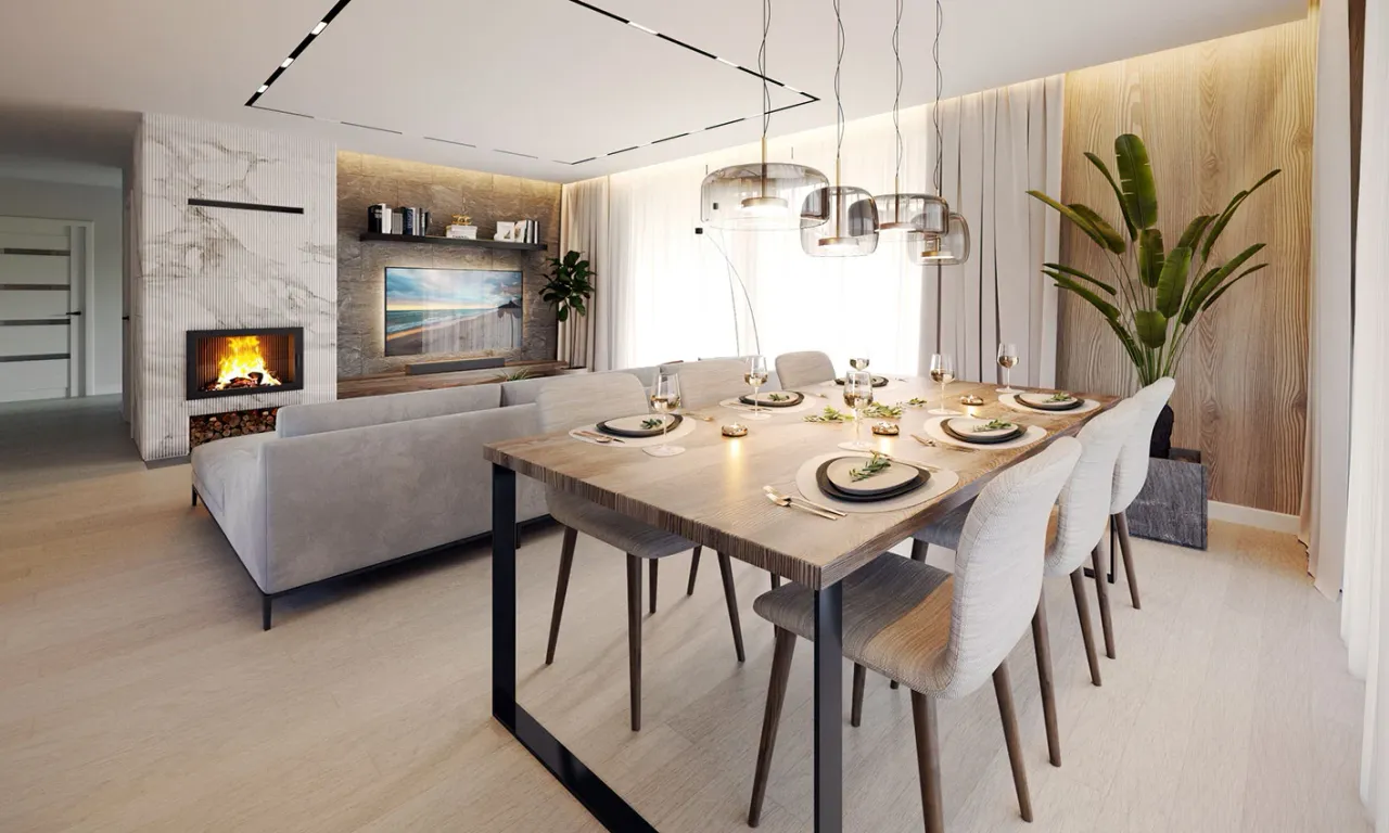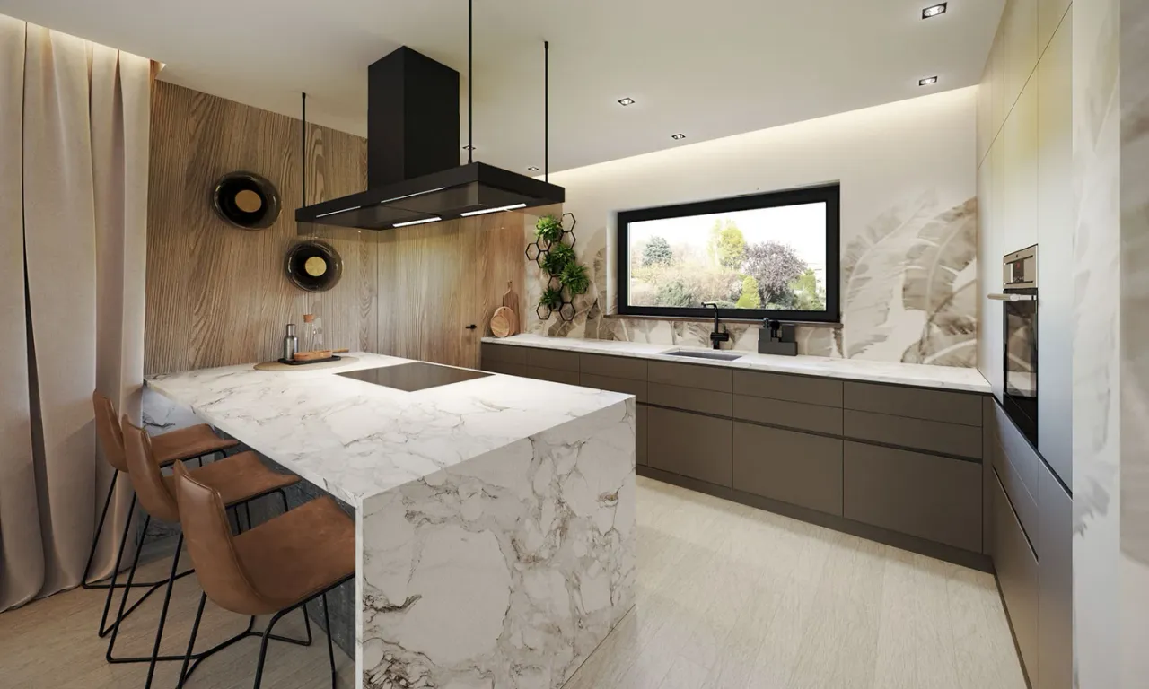 Układ parteru oferuje cztery komfortowe pokoje, funkcjonalną pralnię oraz oddzielną spiżarnię przyległą do kuchni. Wszystko to pozwala na szybką organizację codziennych spraw. Garaż na dwa auta dyskretnie łączy się z częścią mieszkalną, dając dostęp do wnętrza nawet podczas niepogody.