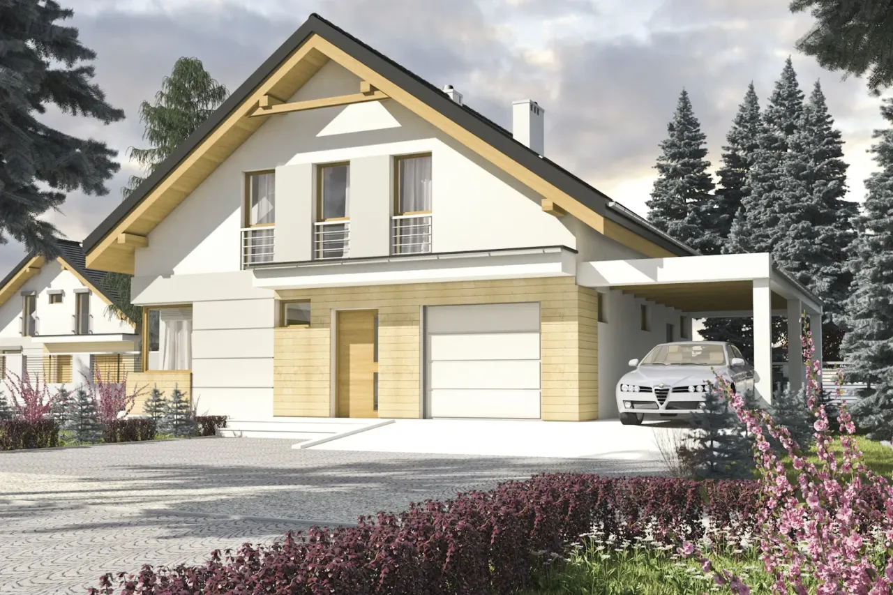 Wypełnij formularz i otrzymaj rysunki w pdf z dokładnymi wymiarami budynku i pomieszczeń (długość, szerokość, wysokość) dla projektu Nowinka II z garażem i wiatą A1 na paliwo stałe
