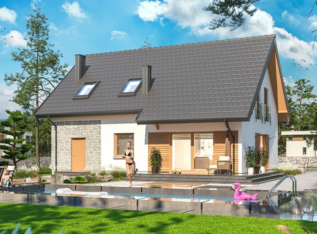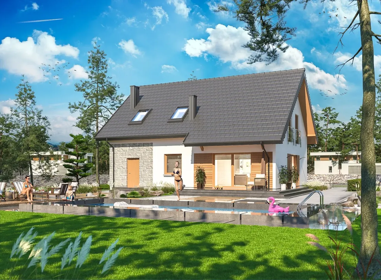 Praktyczna bryła, duże przeszklenia oraz przemyślany układ pomieszczeń z pralnią i dużą kotłownią to zalety, które znacząco poprawiają codzienną wygodę. Dzięki dwuspadowemu dachowi i nowoczesnej technologii murowanej, projekt oferuje zarówno estetykę, jak i trwałość.
