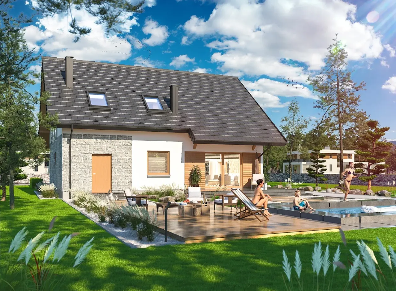 Dom Oberon to doskonały wybór dla inwestorów szukających równowagi pomiędzy tradycyjnymi rozwiązaniami a współczesnym podejściem do budowy. Projekt przewiduje praktyczną strefę dzienną z wyjściem na taras - idealną zarówno na rodzinne spotkania, jak i relaks w cieniu ogrodu. Parter i poddasze użytkowe pozwolą zagospodarować przestrzeń zgodnie z rosnącymi potrzebami rodziny.