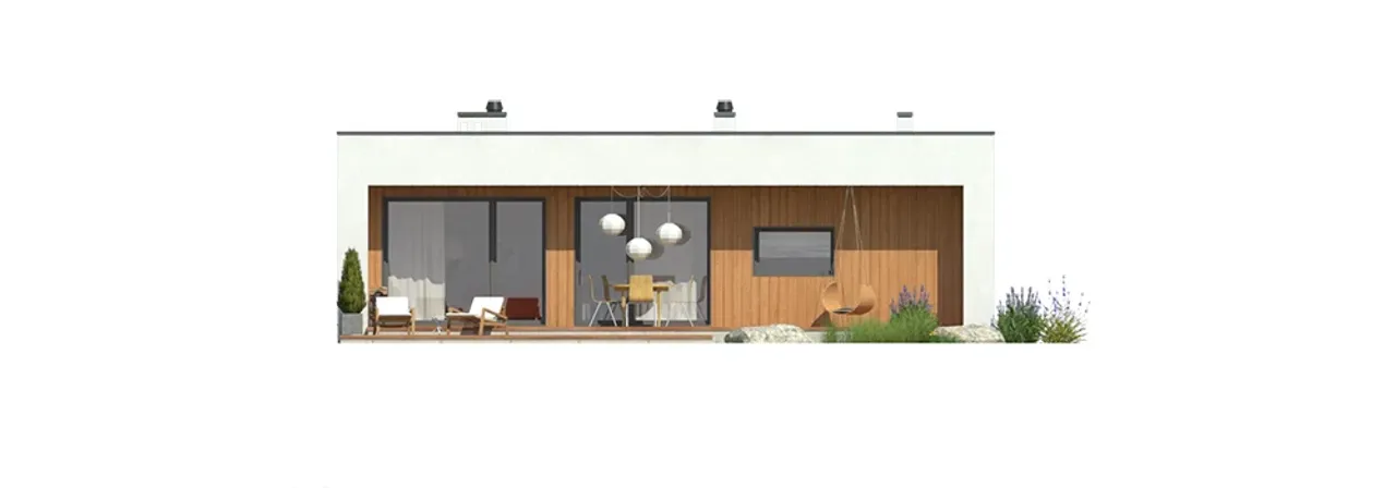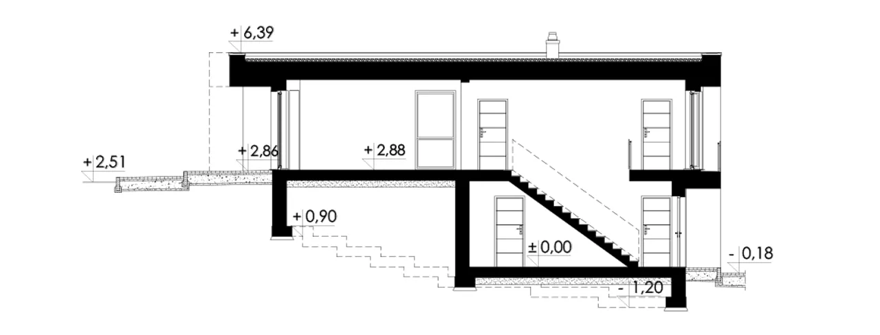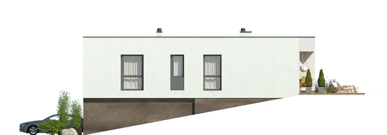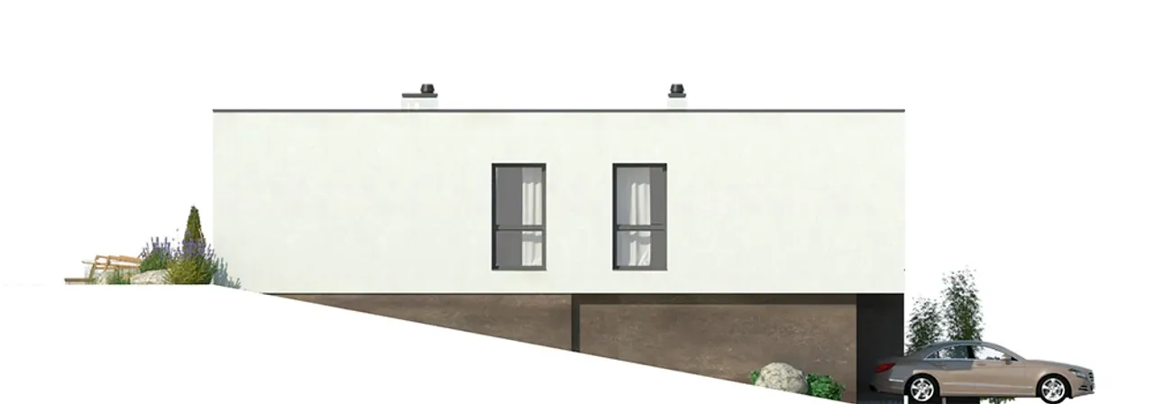 Projekt domu posiada nowoczesny płaski dach ze stropodachem niewentylowanym, pokryty membraną dachową, która chroni wnętrza przed wilgocią oraz wpływem czynników zewnętrznych. W konstrukcji zastosowano żelbetowe stropy oraz jednobiegowe schody, co gwarantuje stabilność całej bryły oraz długowieczność budynku.