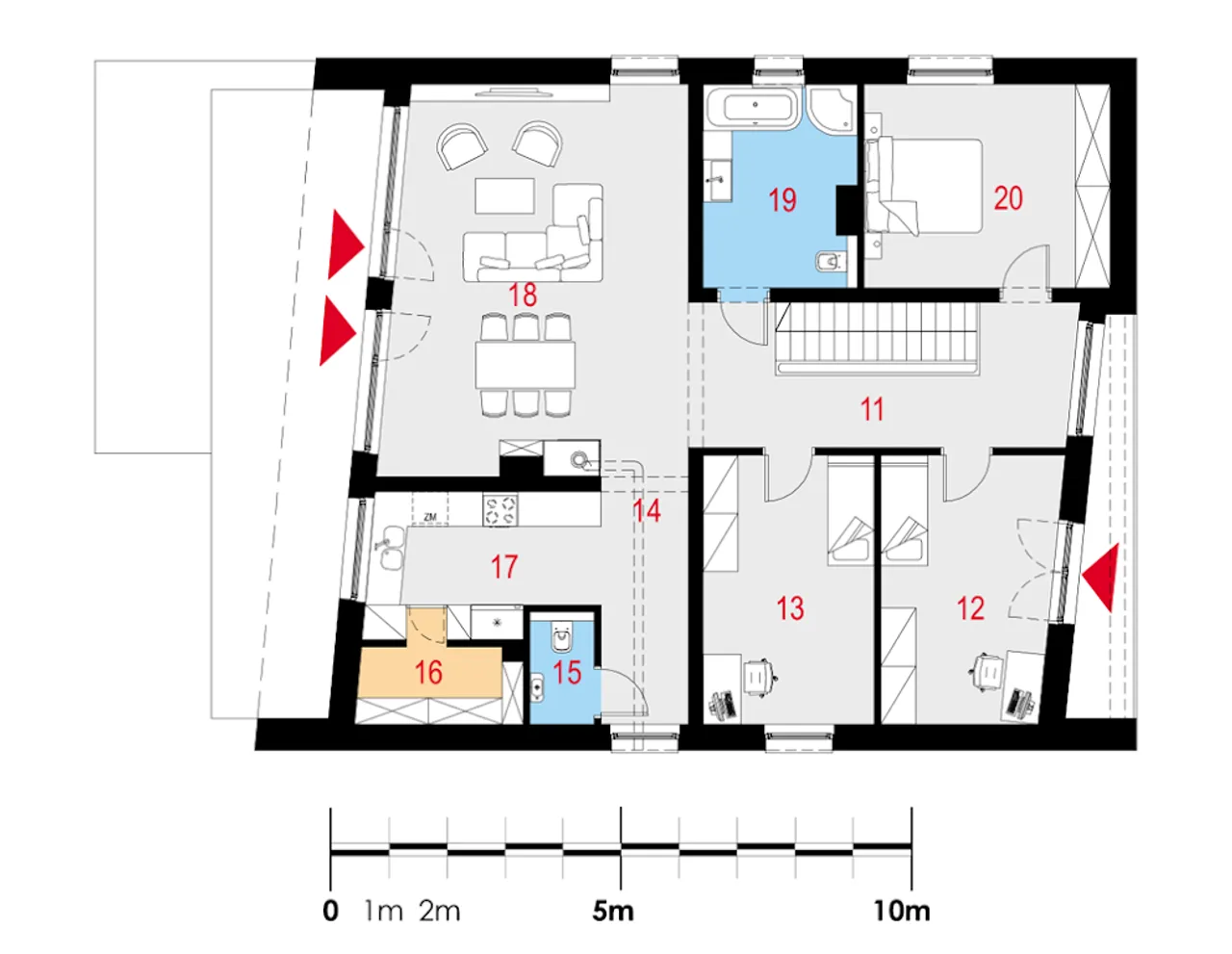 Ściany z pustaków ceramicznych o solidnej grubości z dodatkową warstwą styropianu Termo Organika stanowią skuteczną barierę cieplną. Energooszczędność dodatkowo wspierają nowoczesne okna i drzwi PVC z roletami zewnętrznymi. Praktyczne detale, takie jak przestronna spiżarnia czy segmentowa brama garażowa, ułatwiają codzienne funkcjonowanie.