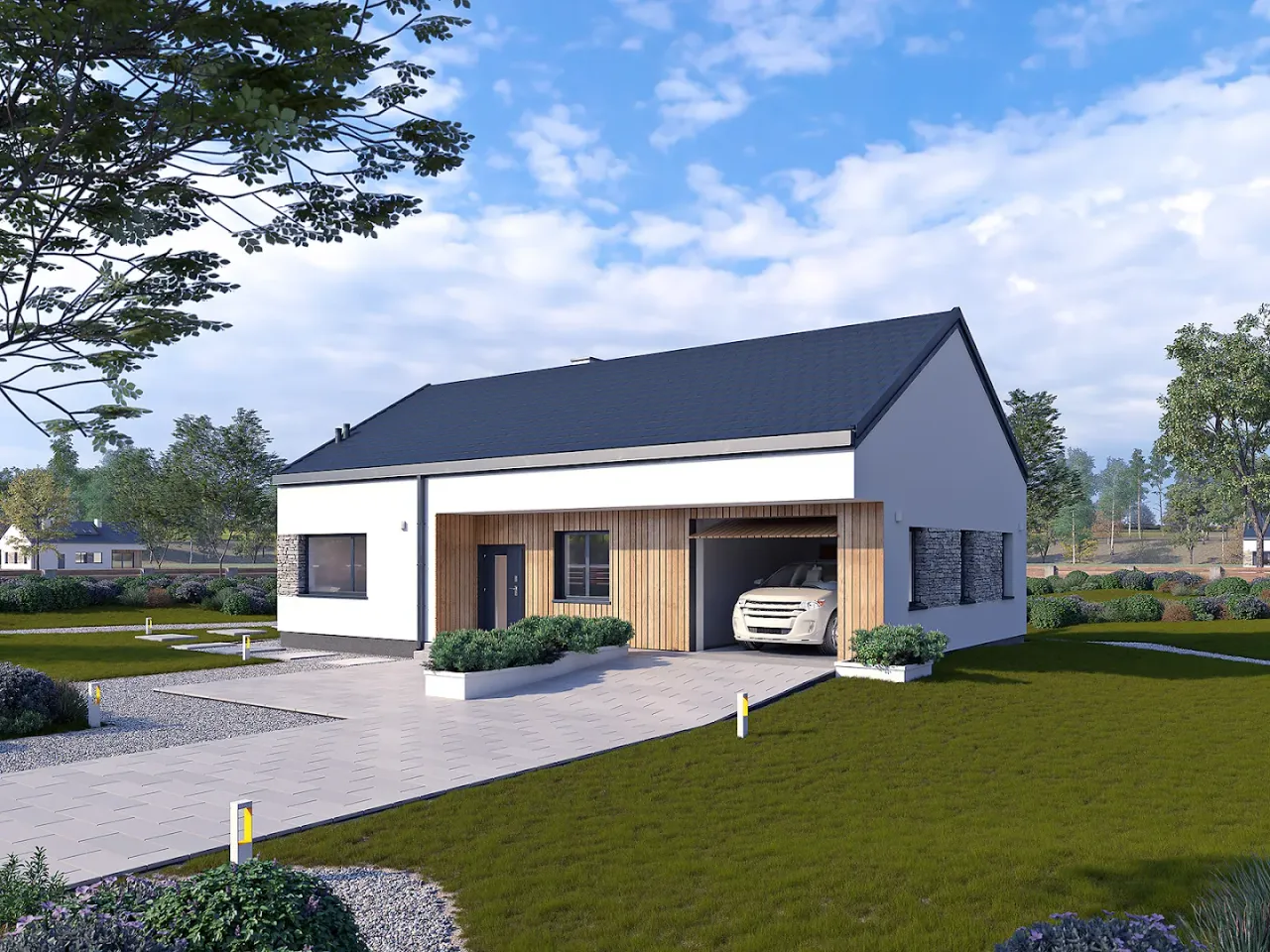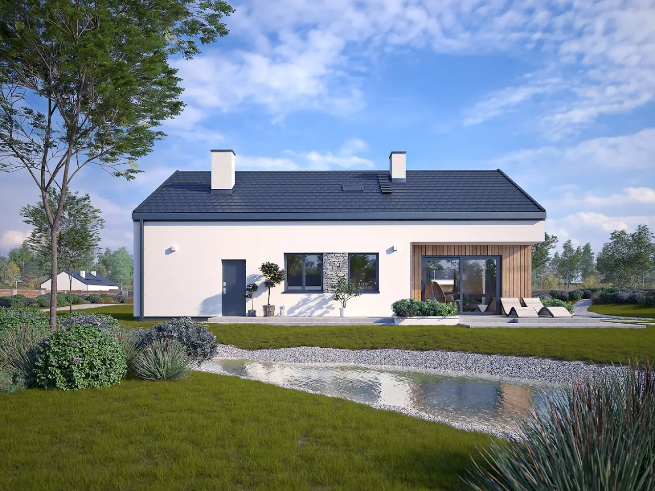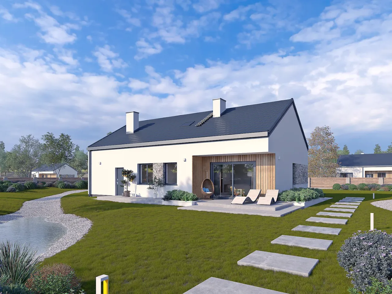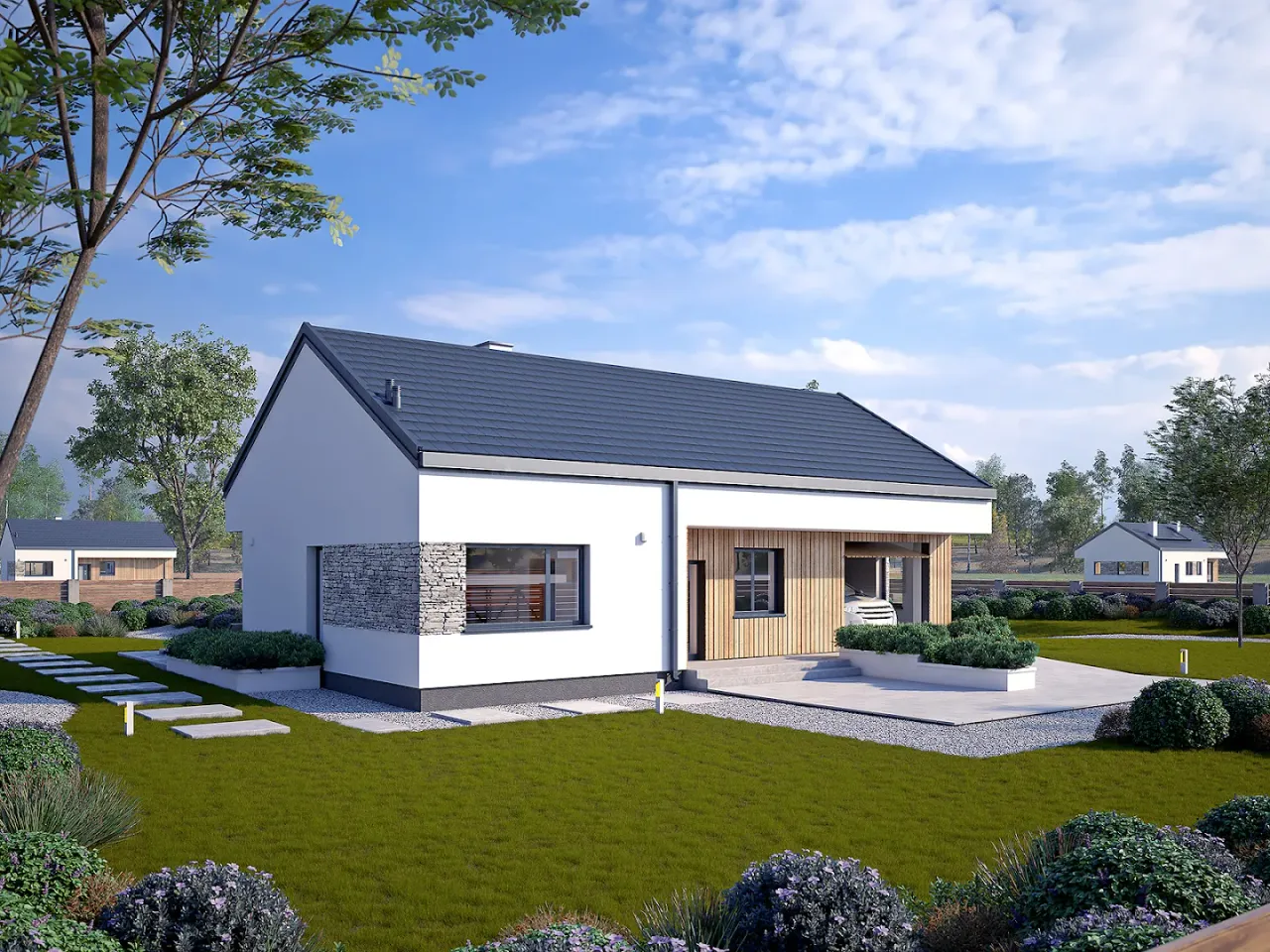 Projekt domu Olcha to atrakcyjna propozycja dla rodzin szukających funkcjonalnego i estetycznego domku. Budynek charakteryzuje się zgrabną sylwetką oraz przemyślanym rozkładem pomieszczeń, co sprawia, że jest bardzo praktyczny w codziennym użytkowaniu. Duże okna zapewniają dobre doświetlenie wnętrz, co wpływa pozytywnie na atmosferę domu. Na uwagę zasługuje także wygodny układ pomieszczeń, co ułatwia organizację przestrzeni. Prosty, a jednocześnie elegancki wygląd sprawia, że projekt ten świetnie wpisuje się w różnorodne krajobrazy, zarówno miejskie, jak i te na terenach wiejskich.