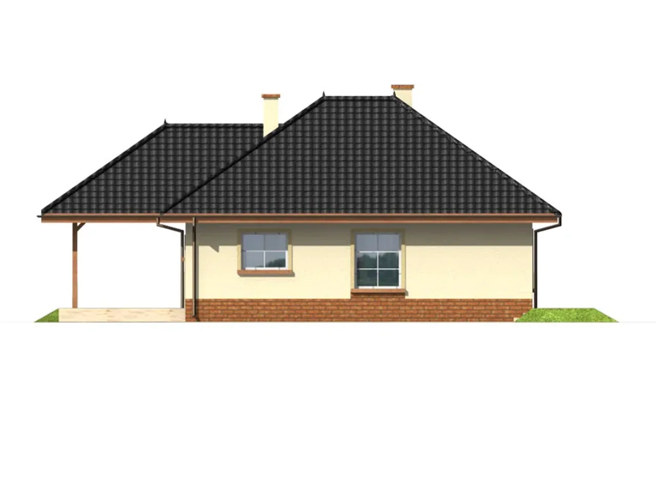 Projekt domu Olga to wygodny parterowy dom z nieużytkowym poddaszem i wiatą garażową o nieregularnej lecz ciekawej bryle z wielospadowym dachem. Dzięki funkcjonalnemu układowi pomieszczeń, na parterze znajduje się wiatrołap, hall, pomieszczenie gospodarcze, kuchnia, salon kominkowy z jadalnią, łazienka oraz cztery pokoje sypialniane. Projekt domu Olga został wykonany z naciskiem na komfort i ograniczenie powierzchni niewykorzystanej.