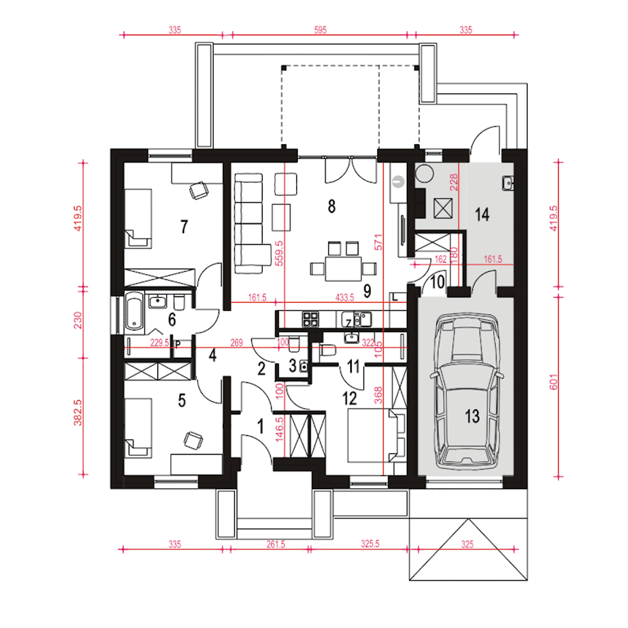Wypełnij formularz i otrzymaj rysunki w pdf z dokładnymi wymiarami budynku i pomieszczeń (długość, szerokość, wysokość) dla projektu Opal z garażem 1-st. A