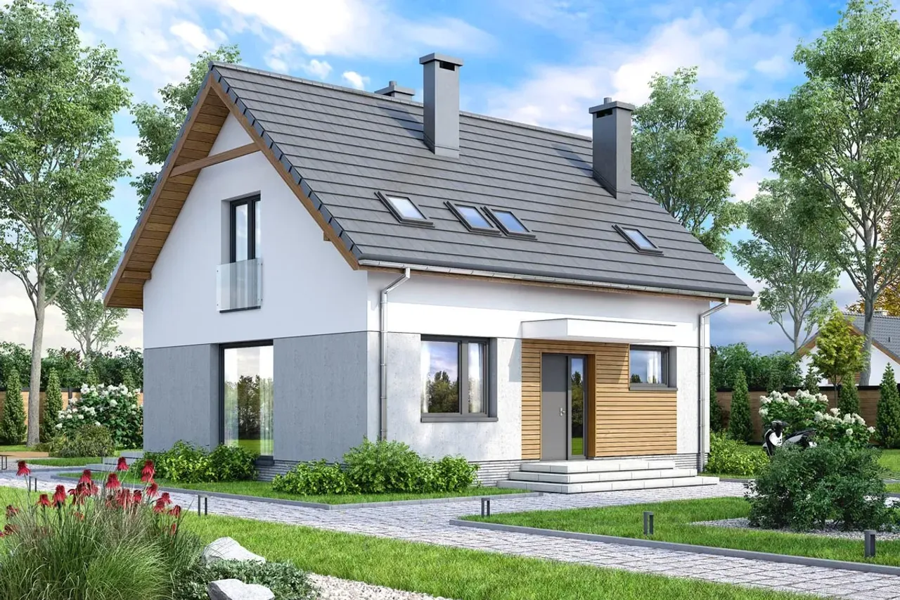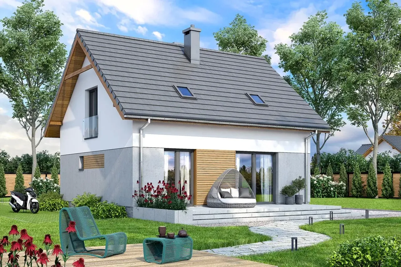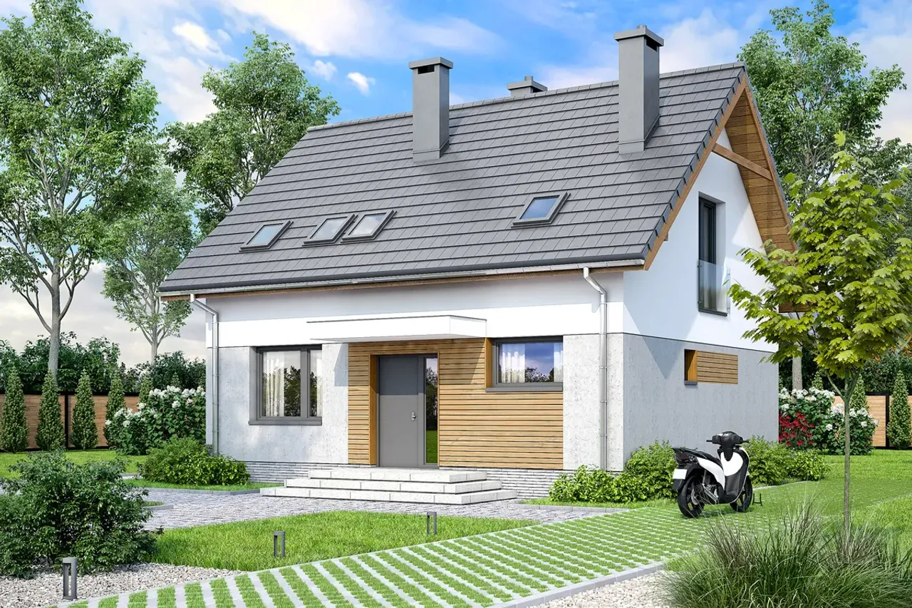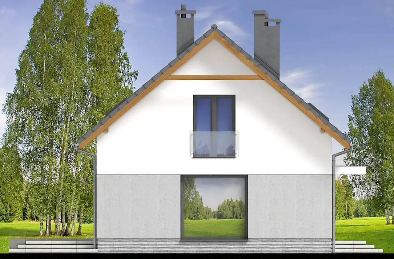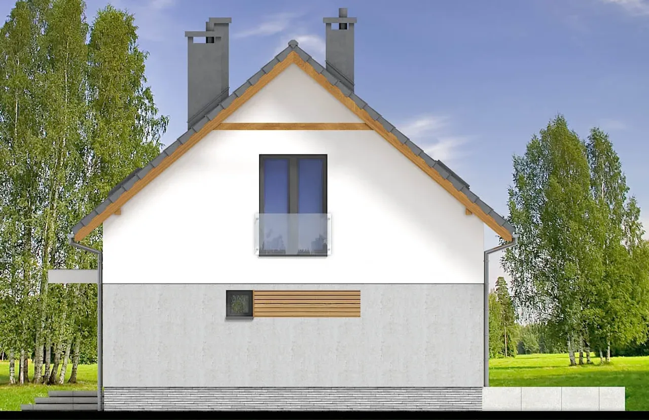 Drewniana konstrukcja dachu, pokryta betonową lub ceramiczną dachówką, zabezpiecza przed zmiennymi warunkami atmosferycznymi oraz pozwala na wygodną adaptację poddasza do ulubionych aranżacji. Cztery komfortowe pokoje na parterze i poddaszu zapewnią przestrzeń zarówno dla rodziny, jak i np. gabinetu, pokoju gościnnego czy przestrzeni rekreacyjnej. Brak garażu pozostawia więcej miejsca na ogród lub rekreację na świeżym powietrzu.