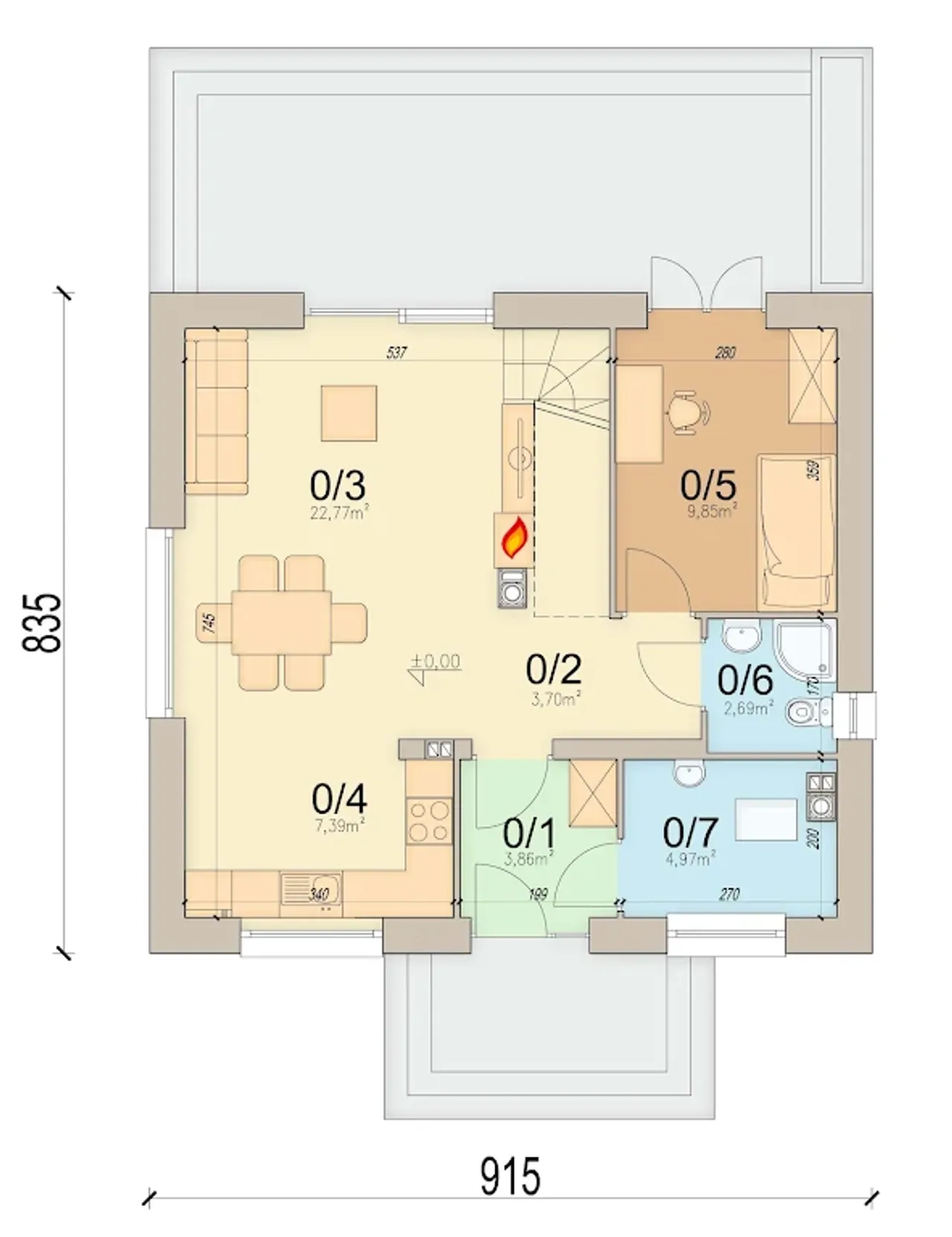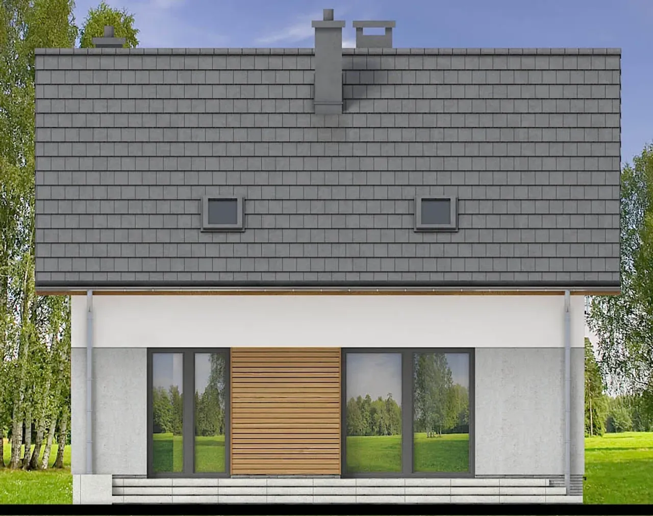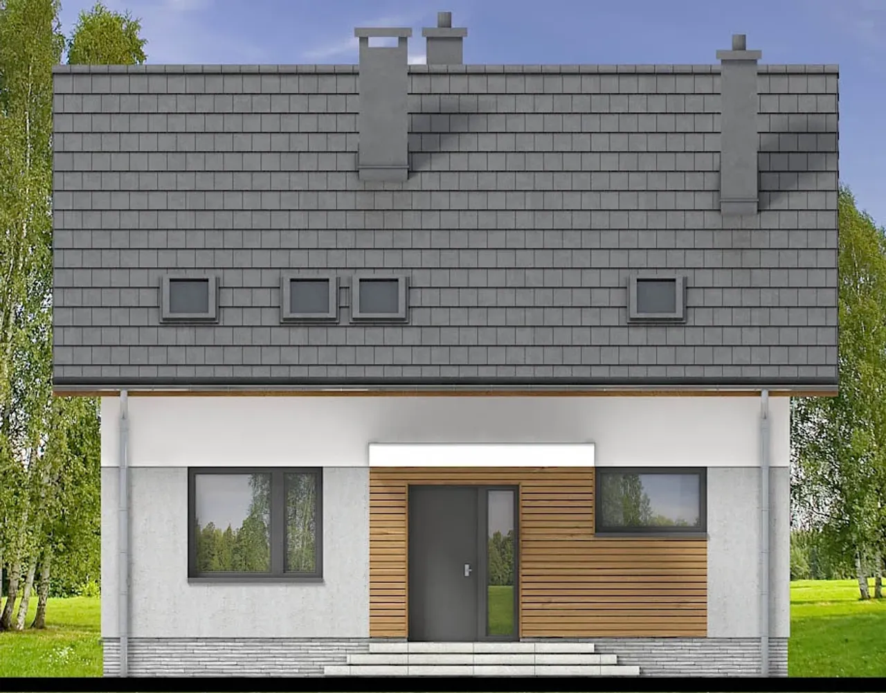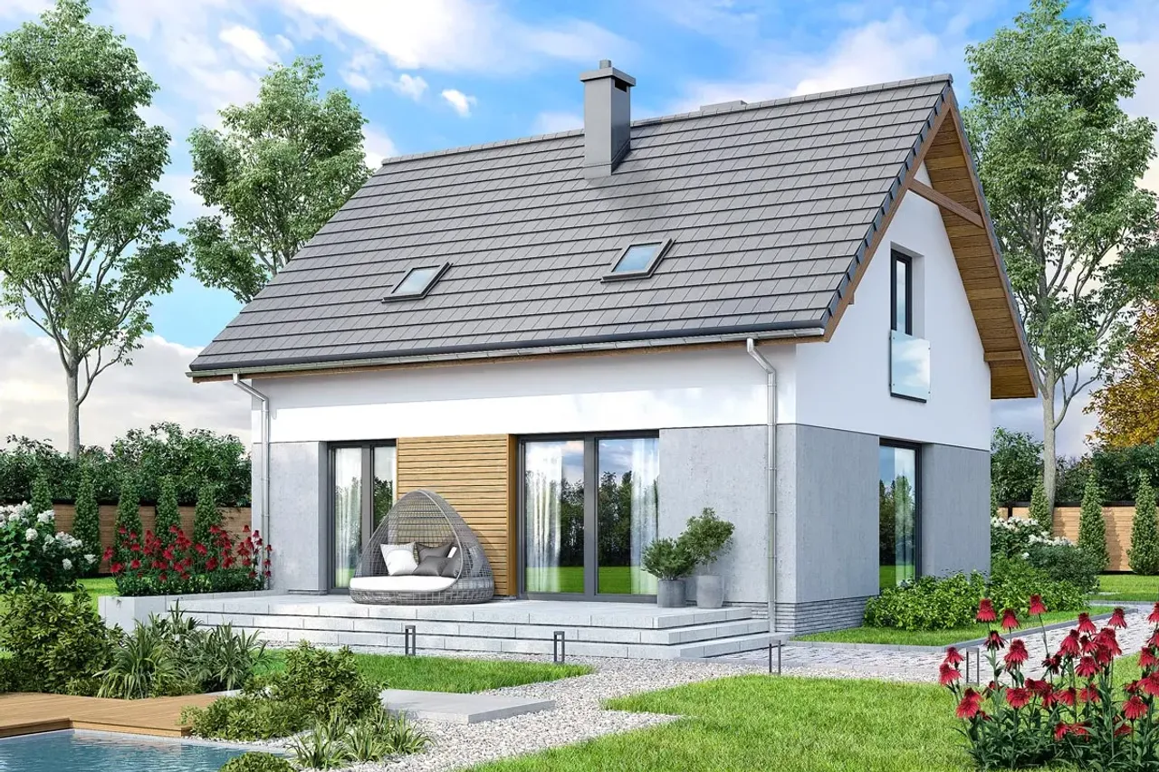 Drewniana konstrukcja dachu, pokryta betonową lub ceramiczną dachówką, zabezpiecza przed zmiennymi warunkami atmosferycznymi oraz pozwala na wygodną adaptację poddasza do ulubionych aranżacji. Cztery komfortowe pokoje na parterze i poddaszu zapewnią przestrzeń zarówno dla rodziny, jak i np. gabinetu, pokoju gościnnego czy przestrzeni rekreacyjnej. Brak garażu pozostawia więcej miejsca na ogród lub rekreację na świeżym powietrzu.