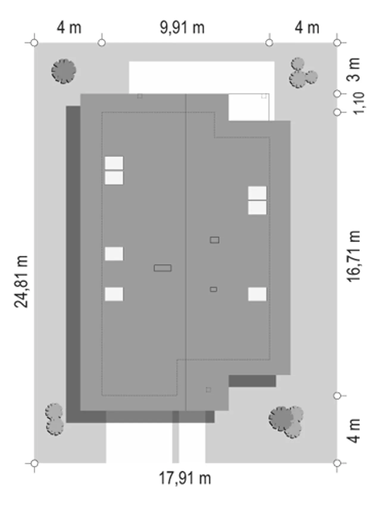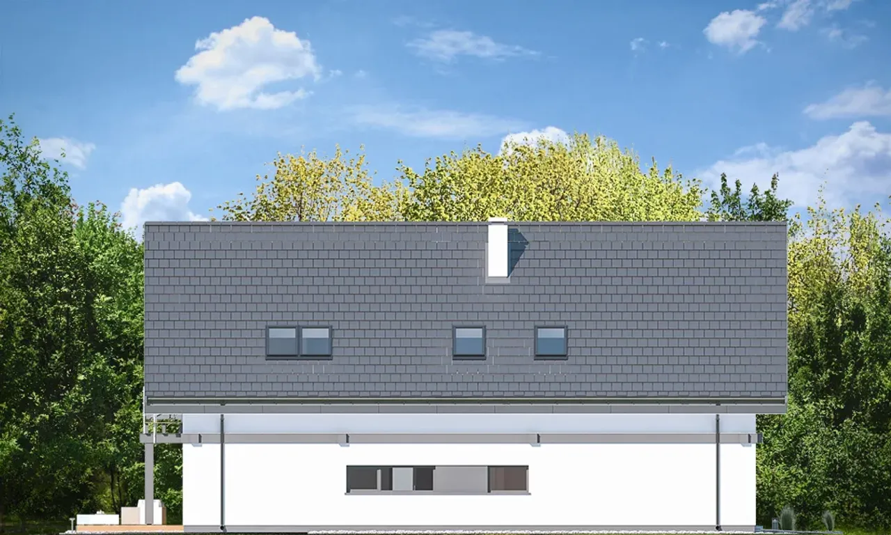 Projekt charakteryzuje ładna prosta bryła w dość nowoczesnej stylistyce wykończenia, przykryta klasycznym dachem dwuspadowym o symetrycznych połaciach. Architektury dopełnia przesunięta ściana szczytowa, która umożliwiła doskonałe wyodbrębnienie zadaszonego tarasu od strony ogrodowej oraz zadaszonego wejścia do budynku.