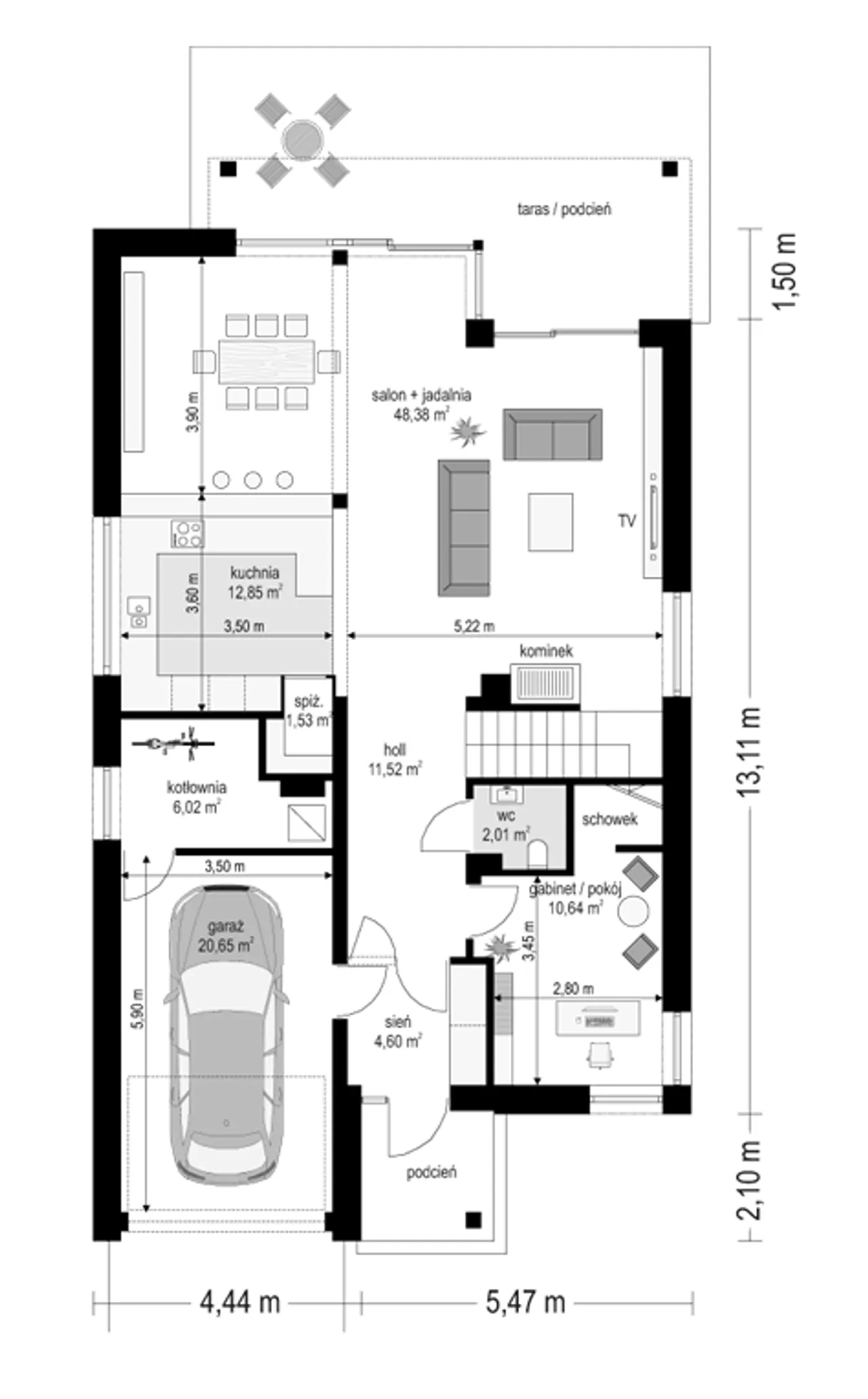 Do wnętrza domu Otwarty 5 prowadzi długi przedsionek połączony z garażem i kotłownią.