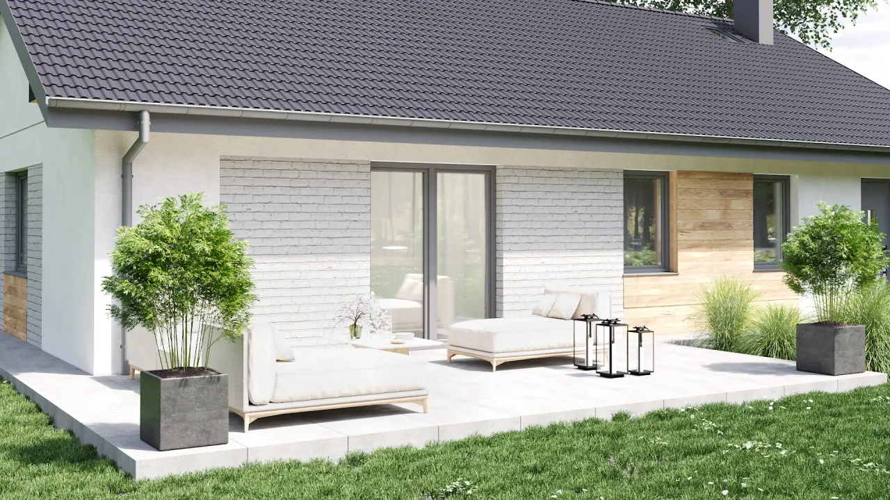 - Ogrzewanie: w standardzie do projektu ogrzewanie podłogowe z źródłami ciepła: biomasa (pellet), gaz z sieci + pakiet grzewczy solarny CWU. Dodatek płatny: pompa ciepła powietrze-woda (zapytaj o niego naszych doradców).