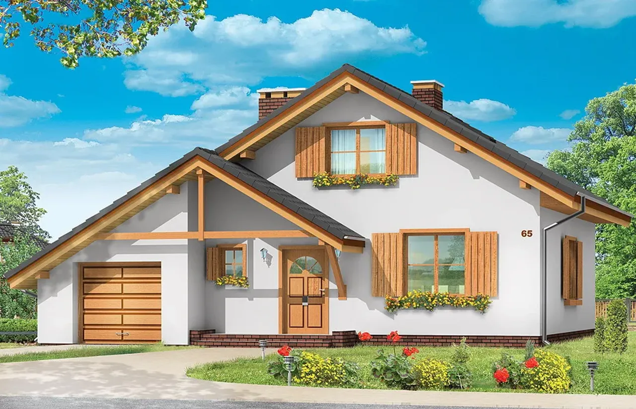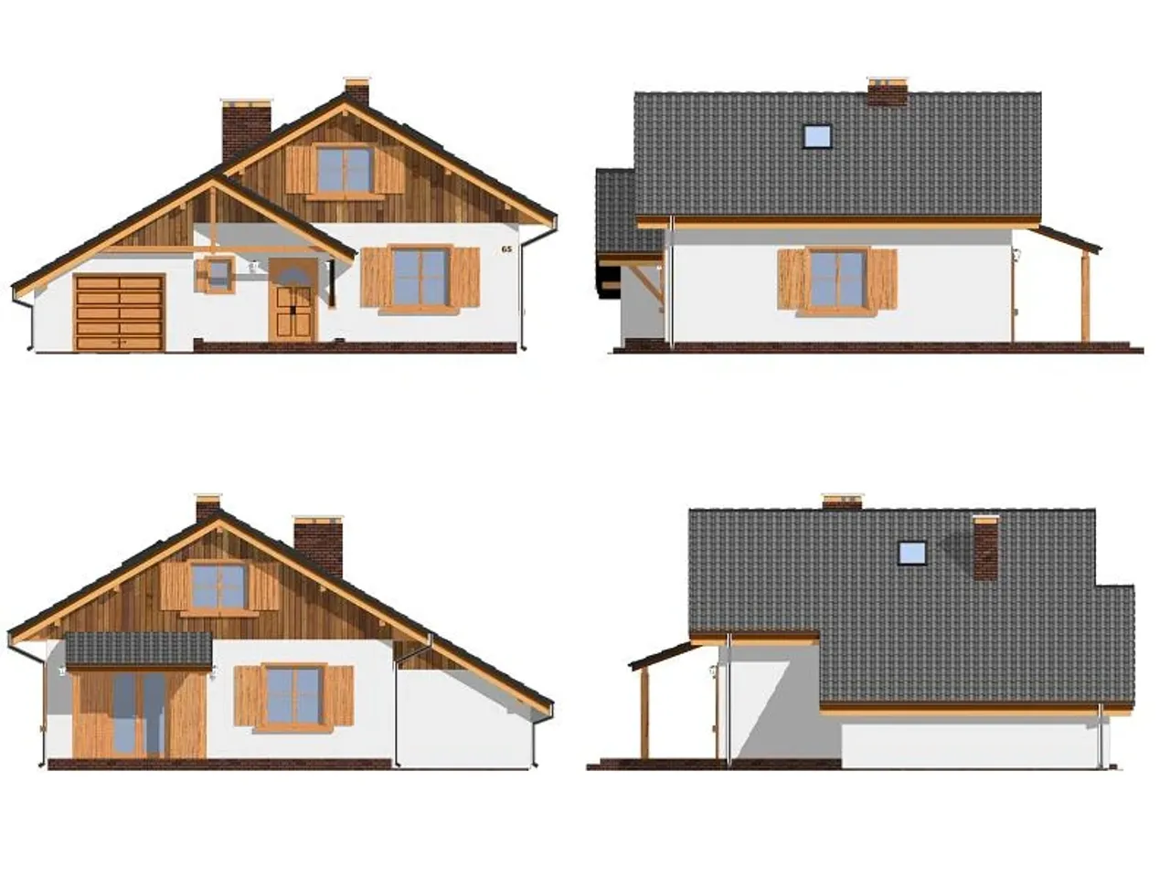 Projekt domu Pchełka z Garażem jest wariantową wersją projektu Pchełka, tym razem z dobudowanym garażem. To dom przeznaczony dla 4-5ciu osób, który może być wykorzystany jako dom całoroczny, lub jako domek letniskowy. To budynek parterowy z poddaszem użytkowym, przykryty dwuspadowym dachem, niepodpiwniczony, z garażem. Powierzchnia użytkowa: 83,13 m2. Budynek może być posadowiony na działce od 300 m2. Projekt przewiduje ogrzewanie wodne zasilane piecem gazowym zainstalowanym w kotłowni przy wejściu do budynku.Alternatywnie można uzyskać ogrzewanie na bazie kominka. Parter projektu domu Pchełka z garażem to otwarta przestrzeń łącząca salon i jadalnię z kominkiem, z dwuskrzydłowym wyjściem na częściowo zadaszony taras. Z boku od strony części jadalnej otwarta kuchnia z przylegającą, spiżarnią. Ponadto na parterze znajduje się pokój. Z holu schody na poddasze. Pod schodami mała łazienka. Poddasze obejmuje dwie sypialnie z oknami szczytowymi i łazienkę doświetloną wyłącznie oknem połaciowym. Budynek ma ciekawą elewację z dużą ilością elementów drewnianych. Wysunięte do przodu zadaszenie garażu tworzy zadaszenie wejścia do budynku. Charakterystyka Energetyczna dla tego projektu jest zgodna z aktualnie obowiązującymi przepisami prawa budowlanego.
