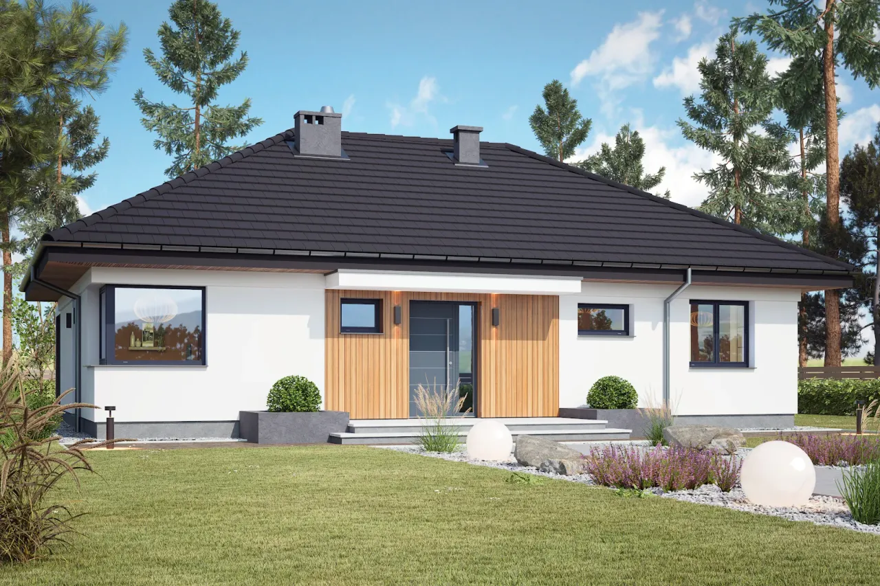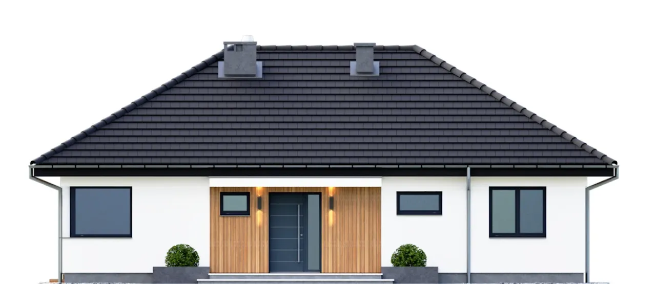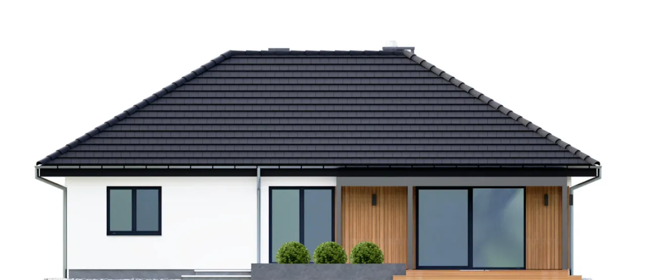 Wiązary prefabrykowane Mitek wykorzystane w konstrukcji dachu skracają czas budowy i ograniczają ryzyko błędów montażowych. Dach wielospadowy pokryty dachówką cementową lub ceramiczną tworzy trwałą, odporną na wiatr i śnieg powłokę. Tynk strukturalny na elewacjach pozwala zastosować nowoczesną kolorystykę, która dobrze współgra z otoczeniem miejskim i podmiejskim.