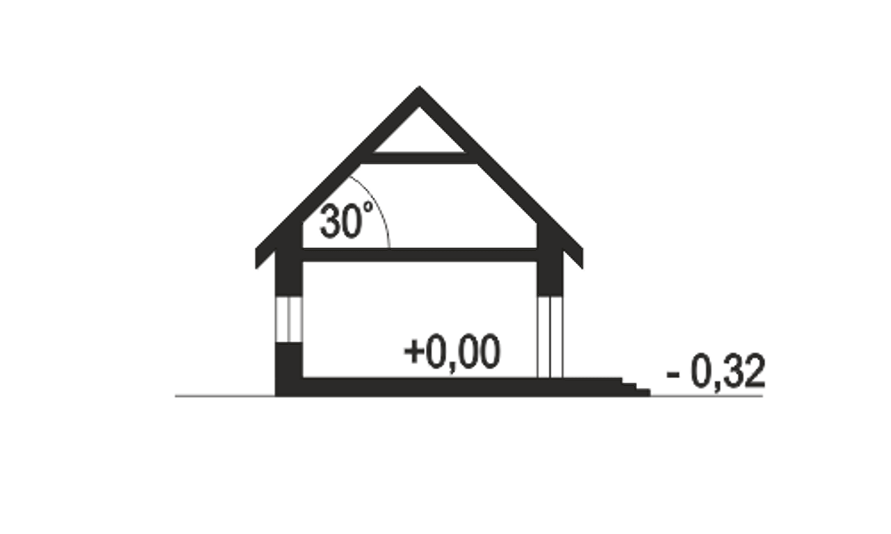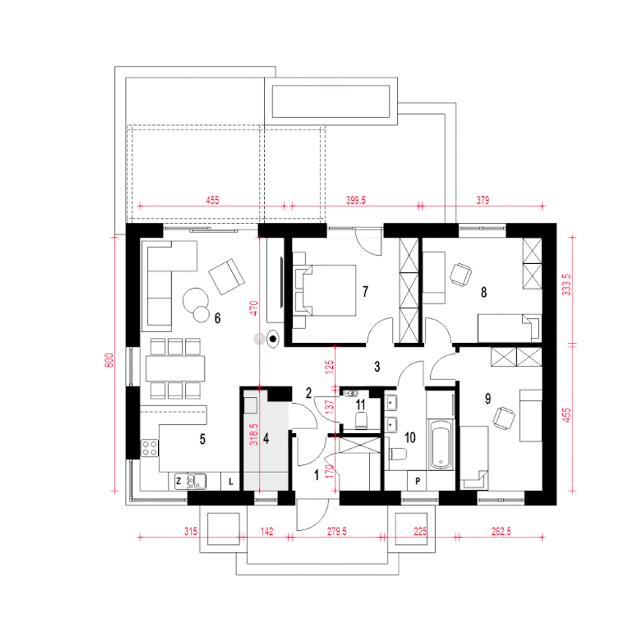 Dom jednorodzinny całoroczny w technologii murowanej tworzy stabilną, masywną konstrukcję, która dobrze akumuluje ciepło. Dzięki parterowemu układowi wszystkie najważniejsze pomieszczenia pozostają łatwo dostępne, bez konieczności pokonywania schodów. Kalenica równoległa do drogi ułatwia ustawienie budynku względem wjazdu i ogrodu, co przekłada się na czytelny podział stref: wejściowej oraz rekreacyjnej.