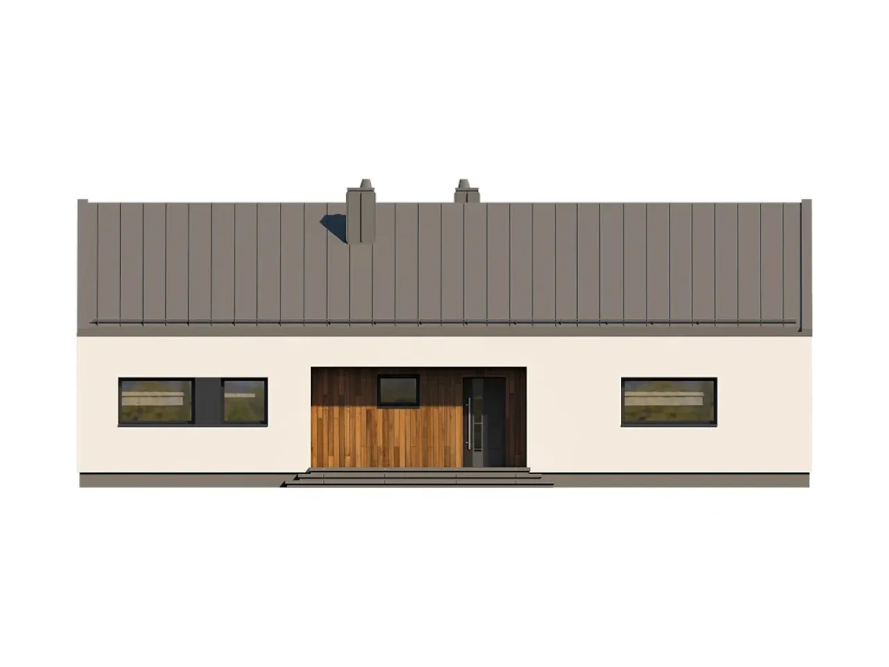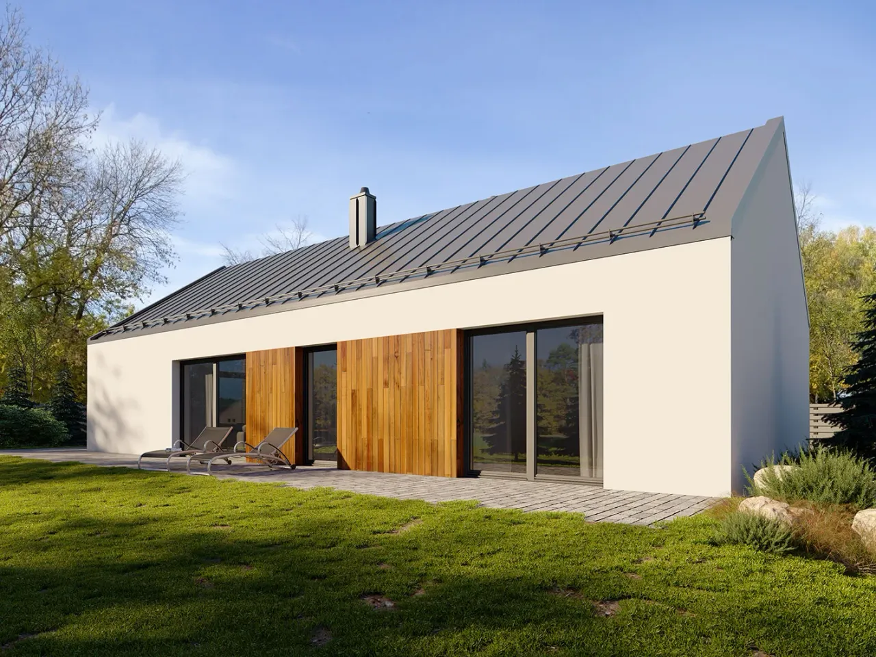 Szlachetnie prosty, nowoczesny dom jednorodzinny to propozycja dla tych, którzy szukają przemyślanych rozwiązań oraz ponadczasowego wyglądu. Parterowy budynek z funkcjonalnym rozkładem oraz kominkiem w salonie pozwala zamieszkać wygodnie przez cały rok. Przestrzeń sprzyja zarówno wspólnemu odpoczynkowi, jak i codziennym obowiązkom.