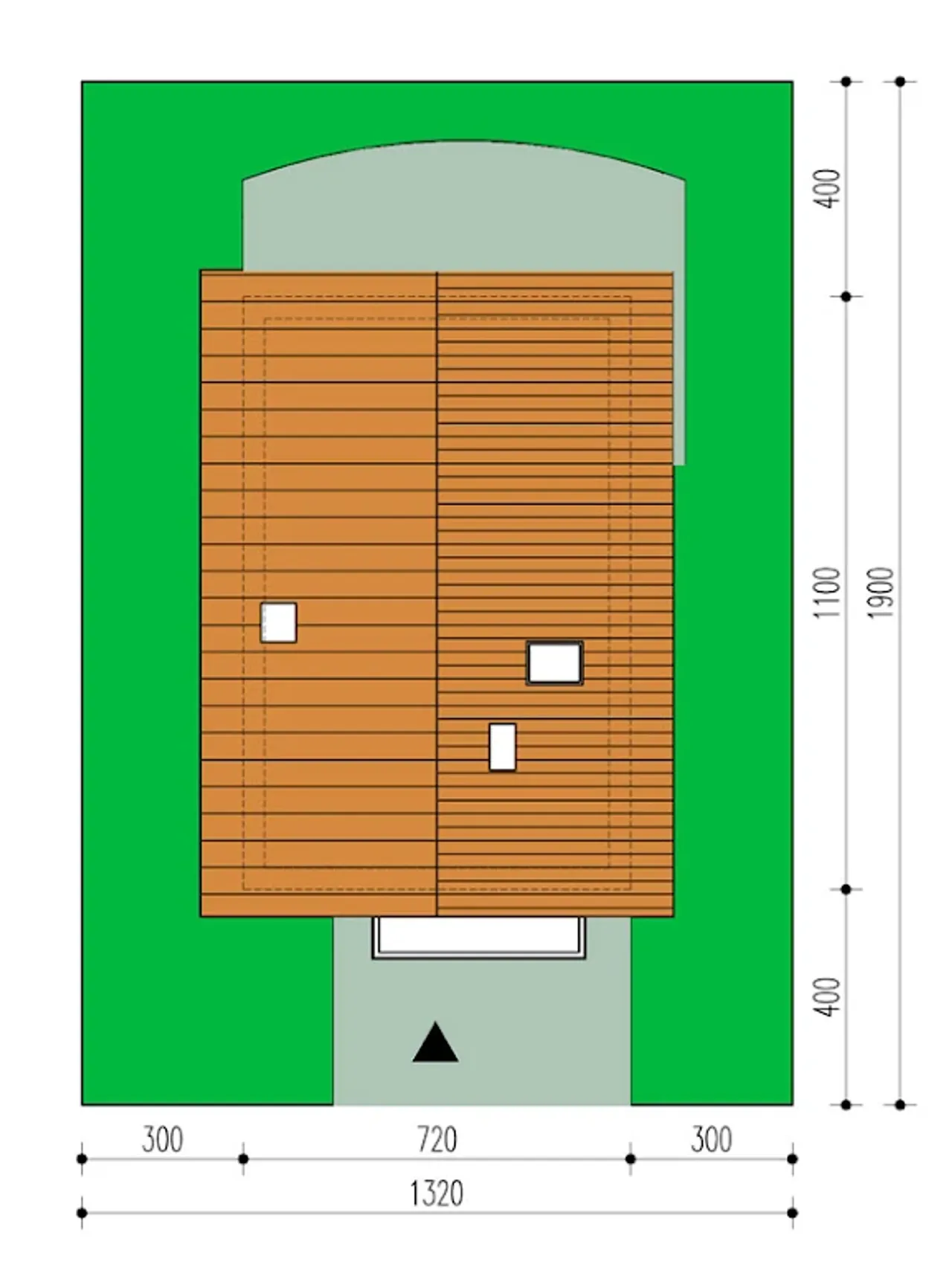 4. Rzut dachu – dokładnie zwymiarowany pokazujący kształt dachu i jego kąt nachylenia ,rozmieszczenie okien połaciowych, lukarn oraz rur spustowych.