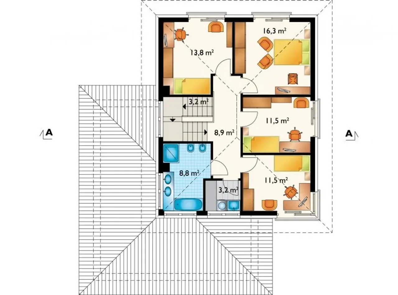 - rzut dachu - ukazuje jego kształt, wymiary, kąt nachylenia połaci, rozmieszczenie okien połaciowych, lukarn, świetlików i rur spustowych, pokazuje rozmieszczenie kominów i informuje o sposobie odwodnienia: rozmieszczeniu i rozmiarach rynien