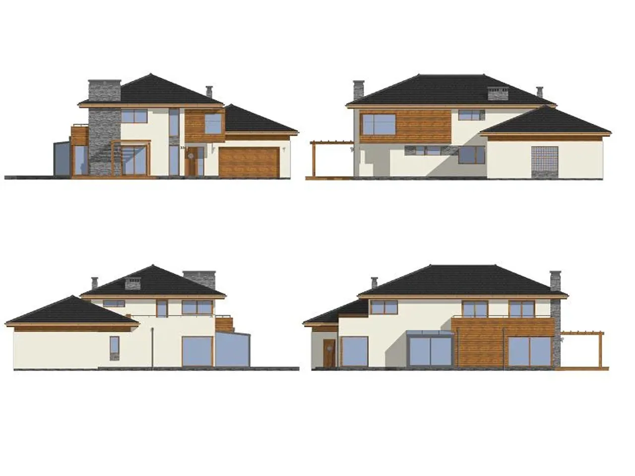 Projekt domu Południowy to komfortowy, bardzo oryginalny dom o nowoczesnej architekturze, dwukondygnacyjny z dustanowiskowym garażem. Zaprojektowano go z myślą o 4-5 osobowej rodzinie. Budynek składa się z głównej, dwukondygnacyjnej bryły oraz parterowej części garażowej. Nowoczesną sylwetkę budynku zapewniają duże przeszklenia, prostokątne wykusze i tarasy piętra. Powierzchnia użytkowa: 277,8 m2. Budynek może być posadowiony na działce od 850 m2. Projekt przewiduje ogrzewanie gazowe. Wnętrze domu na parterze to: przestrzeń dzienna łącząca salon, jadalnię z oranżerią, lub wariantowo podcienionym tarasem. Zaprojektowano tu również pomieszczenie rekreacji, które może również służyć jako biblioteka, pokój sportowy, lub ewentualnie sypialnia gościnna. Bardzo duża kuchnia z wyspą umieszczona została bliżej strefy wejściowej i garaży. Do garażu i pomieszczeń technicznych dostajemy się przez gospodarcze wejście kuchenne. Mieszczą się tam duży dwustanowiskowy garaż, pomieszczenie gospodarcze z dostępem na strych nad garażem, kotłownia-pralnia z wyjściem na ogród i spiżarnia. W projekcie Południowy, na piętrze zaplanowano apartament rodziców z garderobami, łazienką i własnym tarasem, dwie sypialnie z łazienką, oraz gabinet-bibliotekę z oknami widokowymi na część wejściową do domu. Charakterystyka Energetyczna dla tego projektu jest zgodna z aktualnie obowiązującymi przepisami prawa budowlanego.