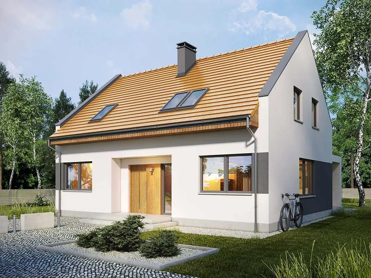 Kupując projekt w technologii murowanej powinieneś budować dom murowany. Zupełna zmiana technologii na szkieletową wymaga przeprojektowania całego budynku ( zmieniają się obciążenia, fundamenty, konstrukcja dachu). Wydamy zgodę na takie przeprojektowanie jednak wiążę się to z dużymi kosztami. Istnieją firmy wykonawcze, które podejmują się zmiany technologii budowy bezpłatnie przy skorzystaniu z ich usług wykonawczych. Zdarza się, że pracownia architektoniczna przygotowuje warianty konkretnego projektu przewidując także inne technologie. Prosimy o sprawdzenie czy istnieje poszukiwana wersja projektu, w zakładce - warianty projektu.