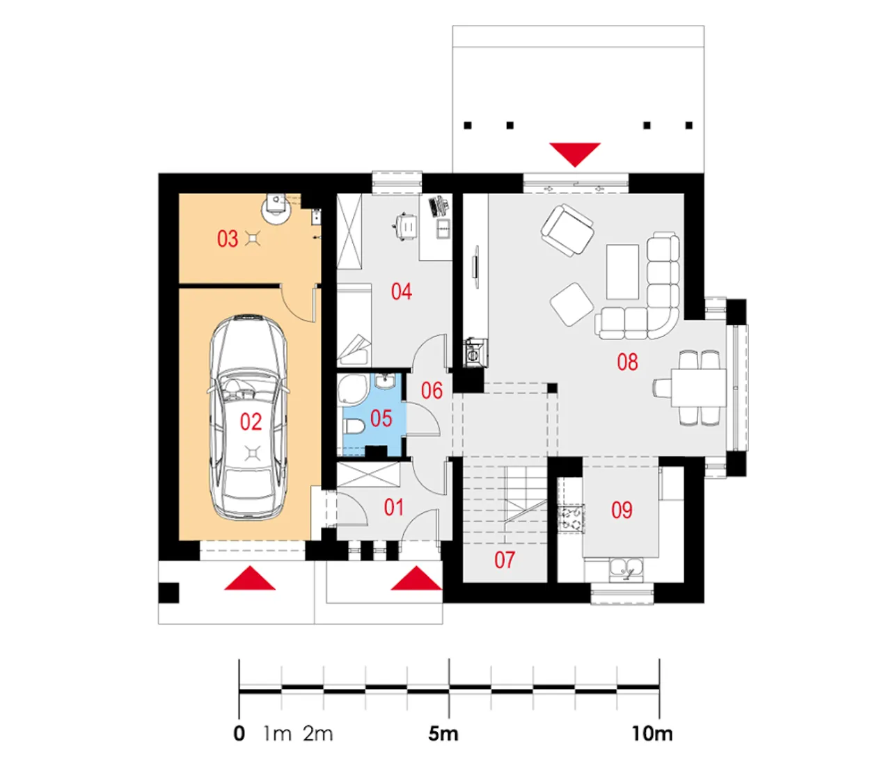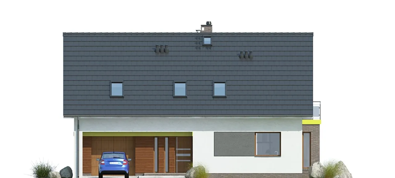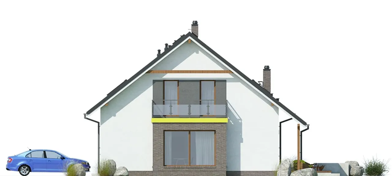 Przemyślany rozkład pomieszczeń pozwala precyzyjnie oddzielić część dzienną od strefy prywatnej. Część gospodarcza została wyposażona w osobną pralnię, a kominek w salonie sprzyja relaksowi w zimowe wieczory. Parterowy układ z użytkowym poddaszem i wysokość ściany kolankowej 98,5 cm gwarantują komfortową aranżację przestrzeni. Garaż wkomponowany w bryłę budynku usprawnia codzienne funkcjonowanie, a dostęp do niego zapewniają solidne betonowe schody.
