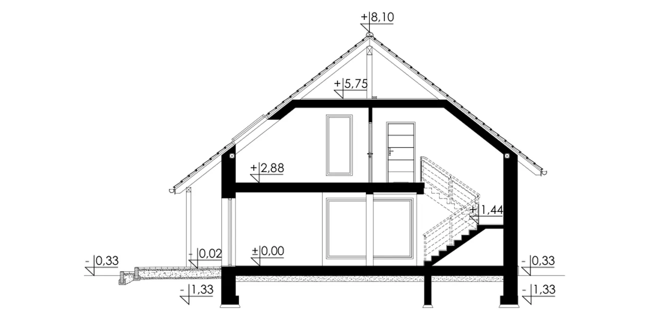 Projekt domu Properus I G1 to przykład przemyślanej architektury. Prosta bryła i dach dwuspadowy nadają budynkowi ponadczasowego charakteru, skutecznie wpisując się w otoczenie. Konstrukcja opiera się na solidnych ścianach z betonu komórkowego, co wpływa na utrzymanie optymalnych warunków cieplnych niezależnie od pory roku. Elegancji dodaje pokrycie z ceramicznej dachówki oraz okna PVC z roletami zewnętrznymi, które skutecznie chronią przed słońcem i zwiększają bezpieczeństwo.