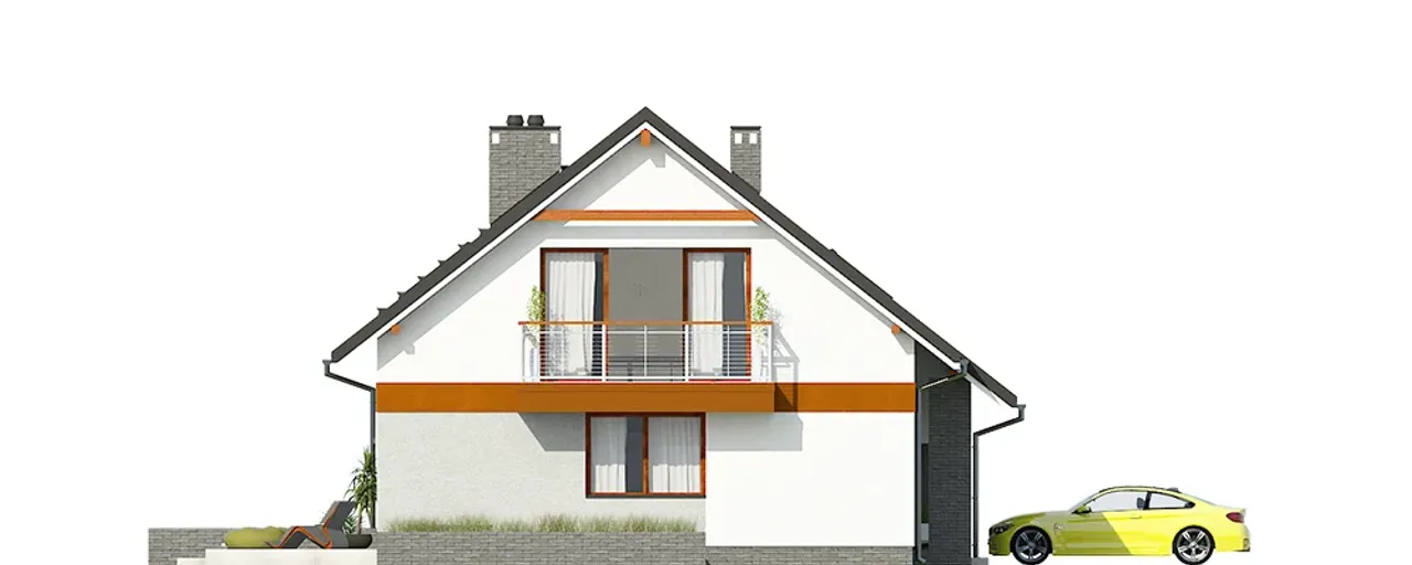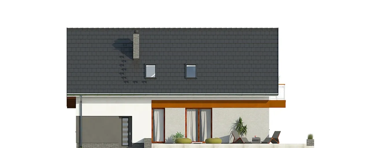Projekt doskonale wpisuje się w założenia budownictwa nowoczesnego: klasyczna bryła z dwuspadowym dachem, starannie przemyślane rozplanowanie przestrzeni oraz zastosowanie sprawdzonych materiałów, takich jak pustak ceramiczny LEIER i żelbetowy strop. Całość dopełniają energooszczędne okna z roletami i segmentowa brama garażowa. Poznaj atuty tego domu i wybierz rozwiązanie dopasowane do potrzeb Twojej rodziny!