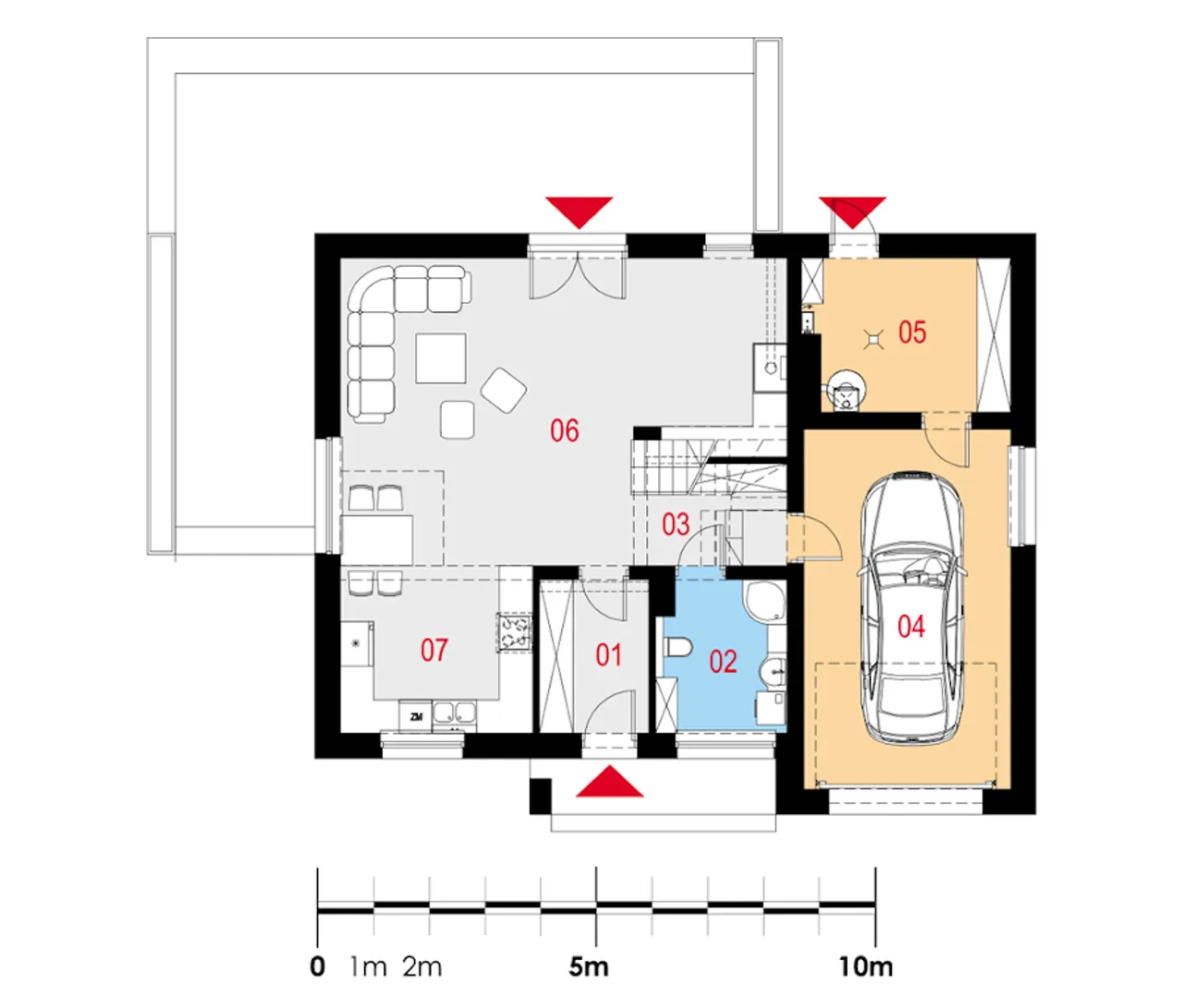 Dom jednorodzinny całoroczny Propositus I G1 powstał z myślą o wygodzie czteroosobowej rodziny, która ceni zarówno prywatność, jak i spójną, otwartą przestrzeń. Parterowe rozwiązanie z poddaszem to kompromis pomiędzy praktycznym rozmieszczeniem pokoi a możliwością ich adaptacji do potrzeb domowników. Cztery pokoje gwarantują wszechstronność wykorzystania pomieszczeń - od sypialni po gabinet.